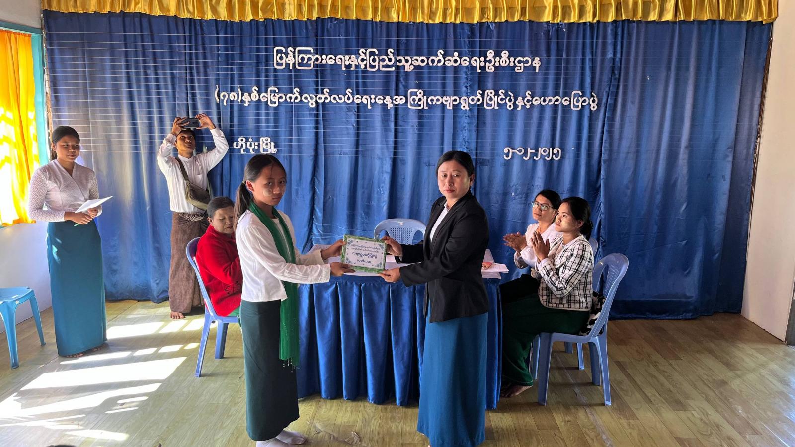 ထို့နောက် အခမ်းအနားကို ဆက်လက်ကျင်းပရာ ကဗျာရွတ်ဆိုပြိုင်ပွဲတွင် ပထမ၊ ဒုတိယ၊ တတိယနှင့် နှစ်သိမ့်ဆုရရှိသော ကျောင်းသား၊ ကျောင်းသူများကို ပြန်ကြားရေးနှင့်ပြည်သူ့ဆက်ဆံရေးဦးစီးဌာန၊ ပအိုဝ်းကိုယ်ပိုင်အုပ်ချုပ်ခွင့်ရဒေသအဆင့်ရုံးမှ လက်ထောက်ညွှန်ကြားရေးမှူး ဒေါ်ဥမ္မာချို၊ အမှတ်(၄) အခြေခံပညာမူလတန်းကျောင်းအုပ်ဆရာမကြီးတို့က ဆုများအသီးသီးချီးမြှင့်ခဲ့ကြသည်။