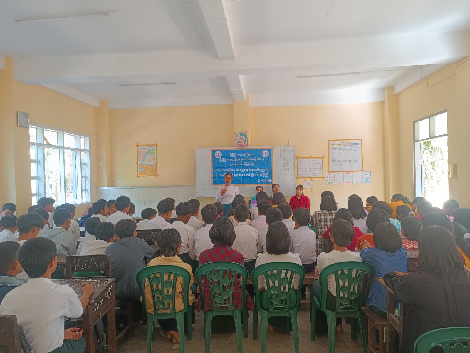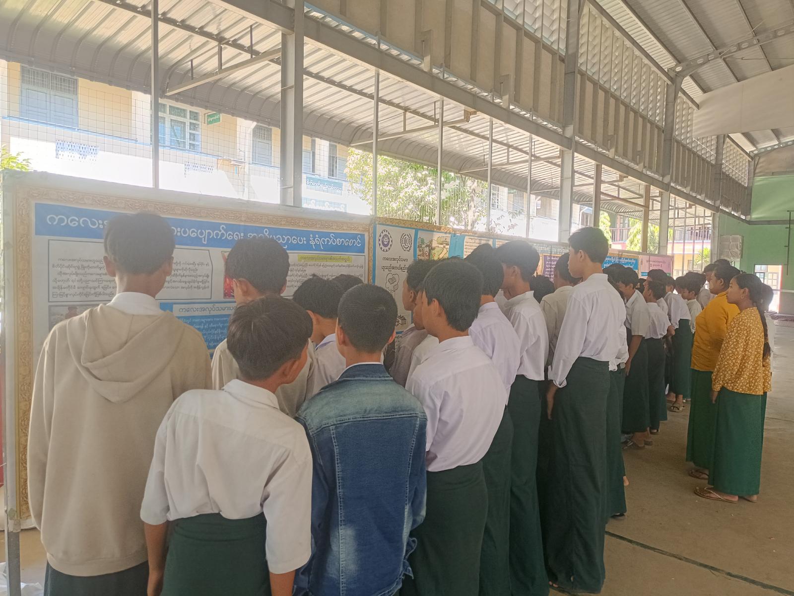 ထို့နောက် ပြန်ကြားရေးနှင့်ပြည်သူ့ဆက်ဆံရေးဦးစီးဌာနမှ ဦးစီးအရာရှိနှင့် ဝန်ထမ်းများက ကျောင်းသား၊ကျောင်းသူများအား အသိပညာဗဟုသုတရရှိစေမည့် စာအုပ်/စာစောင်များအားဖတ်ရှုစေခြင်း၊ ကလေးအလုပ်သမားပပျောက်ရေး အသိပညာပေးနံရံကပ်စာစောင်၊ မူးယစ်ဆေးဝါးနှင့်ပတ်သက်သည့် အသိပညာပေးနံရံကပ်စာစောင်နှင့် သဘာဝဘေးအန္တရာယ်နှင့်ပတ်သက်သည့် အသိပညာပေးနံရံကပ်စာစောင်များပြသခြင်းတို့ဆောင်ရွက်ခဲ့ရာ ကျောင်းသား/ကျောင်းသူများကစိတ်ပါ၀င်စားစွာဖြင့် ကြည့်ရှုလေ့လာမှတ်သားခဲ့ကြကြောင်း သိရသည်။