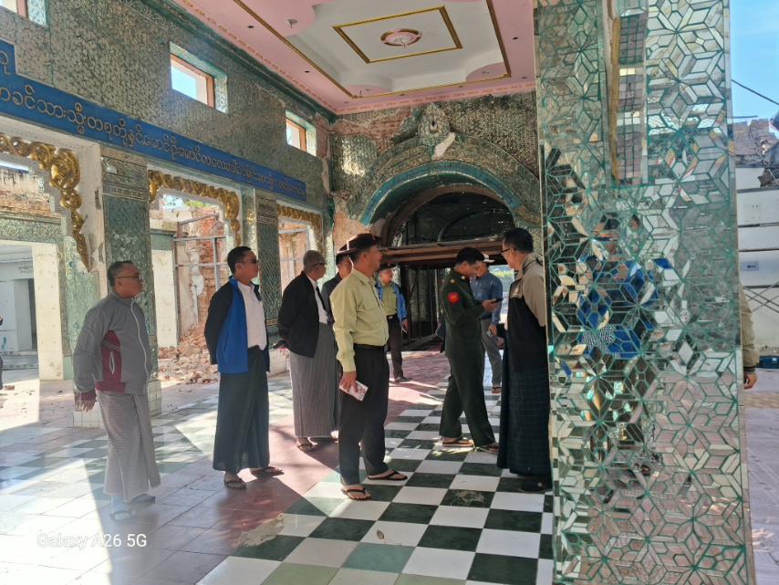 စစ်ကိုင်းတိုင်းဒေသကြီးအစိုးရအဖွဲ့ လူမှုရေးရာဝန်ကြီး ဦးညွန့်ဝင်းအောင်၊ ခရိုင်စီမံခန့်ခွဲရေးနှင့် အုပ်ချုပ်ရေးကော်မတီဥက္ကဋ္ဌ ဦးထွန်းထွန်းဝင်းနှင့် တာဝန်ရှိသူများသည် ယမန်နေ့နံနက်ပိုင်းတွင် မန္တလေးငလျင်ကြီးလှုပ်ခတ်ခဲ့မှုကြောင့် ထိခိုက်ပျက်စီးခဲ့သည့် ရာဇမဏိစူဠာကောင်းမှုတော်စေတီတော်မြတ်ကြီး၏ တောင်ဘက်စောင်းတန်းနှင့် မုခ်ဦး အသစ်ပြန်လည်တည်ဆောက်နေမှု၊ စေတီတော်မြတ်ကြီး ဘက်စုံပြန်လည် ပြုပြင်မွမ်းမံ