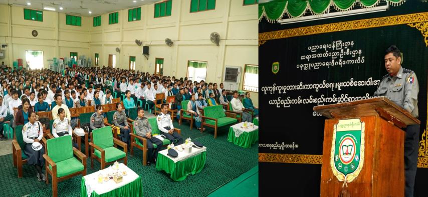 ပညာရေးဝန်ကြီးဌာန၊ ဆရာအတတ်ပညာဦးစီးဌာန၊ ပခုက္ကူပညာရေးဒီဂရီကောလိပ်၌ မူးယစ်ဆေးဝါးအန္တရာယ်၊ ယာဉ်စည်းကမ်း၊ လမ်းစည်းကမ်းနှင့် လူကုန်ကူးမှုတားဆီးကာကွယ်ရေးဆိုင်ရာ အသိပညာပေးဟောပြောပွဲကို ယနေ့နံနက် ၉ နာရီခွဲအချိန်က အဆိုပါကောလိပ်ရှိ မဟာသရေစည်သူ ဦးဘခန်းမတွင် ကျင်းပပြုလုပ်သည်။
