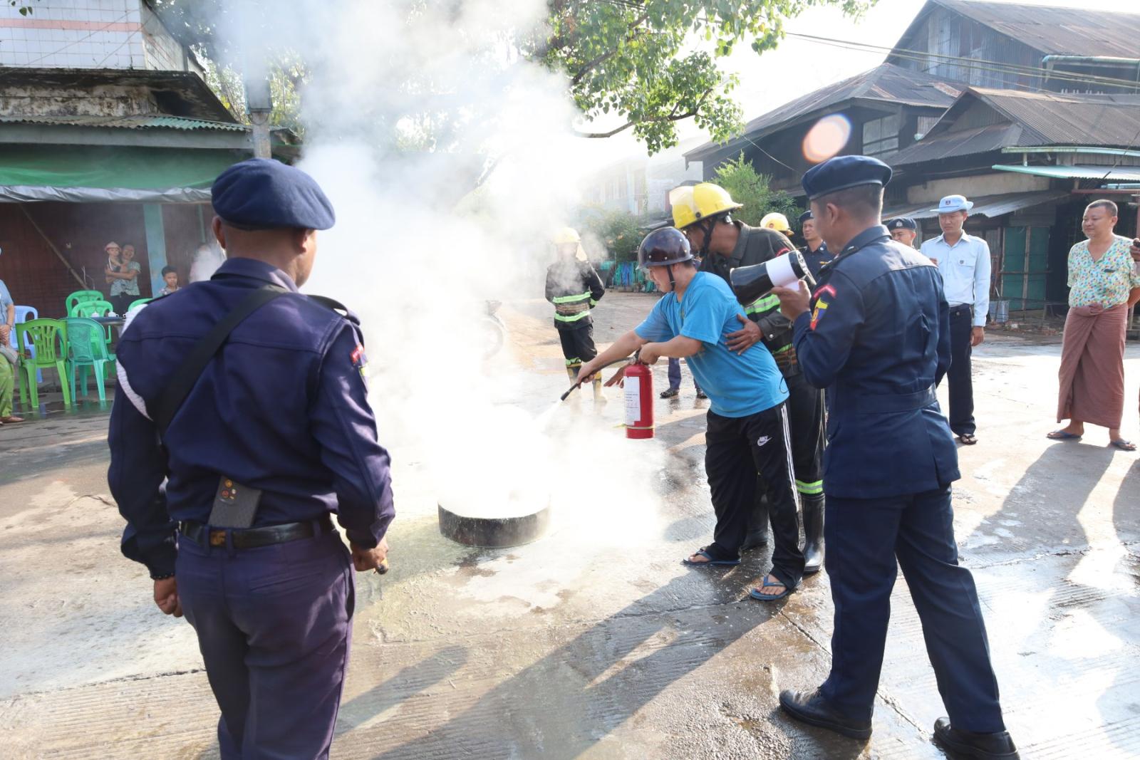 သရုပ်ပြဆောင်ရွက်ရာတွင် မြို့နယ်မီးသတ်ဦးစီးဌာနမှ မီးငြှိမ်းသတ်ယာဉ်များဖြင့် မီးငြှိမ်းသတ်ခြင်း၊ ဆီကြောင့်မီးလောင်မှုဖြစ်ပေါ်လာပါက မီးသတ်ဆေးဗူး အသုံးပြုပုံအဆင့်ဆင့်ကို မီးသတ်ဦးစီးဌာန မြို့နယ်ဦးစီးမှူး ဦးတိုးနိုင်ဦးက အကျယ်တစ်ဝင့် ရှင်းလင်းပြောကြားခဲ့ပြီး မီးသတ်ဆေးဗူးဖြင့် ငြိမ်းသတ်ခြင်း၊ ဖုံးအုပ်နည်းဖြင့် မီးငြိမ်းသတ်ခြင်းတို့ကို စျေးသူ၊ စျေးသားများဖြင့် လက်တွေ့လေ့ကျင့် လုပ်ဆောင်ခဲ့ကြပြီး စျေးအတွင်းရှိ ဆိုင်ခန်းများ၌ မီးဘေးအန္တရာယ် ကြိုတင်ကာကွယ်ရေး လုပ်ဆောင်ထားရှိမှုများအား တာဝန်ရှိသူများက လိုက်လံ ကြည့်ရှုစစ်ဆေးခဲ့ကြသည်။