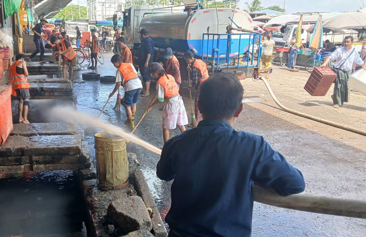 ရန်ကုန်တိုင်းဒေသကြီး၊ မရမ်းကုန်းခရိုင်၊ လှိုင်မြို့နယ် ရွှေပိတောက်ငါးဈေးတွင် ရေစီးရေလာကောင်းမွန်စေရေးနှင့် အနံ့အသက်များ ကင်းစေရေးအတွက် မြို့နယ်စည်ပင်သာယာရေးအဖွဲ့မှ အလုပ်သမားများက ဈေးအတွင်း/အပြင် ရေမြောင်းများ တူးဖော်ဆောင်ရွက်ခဲ့ကြသည်။
