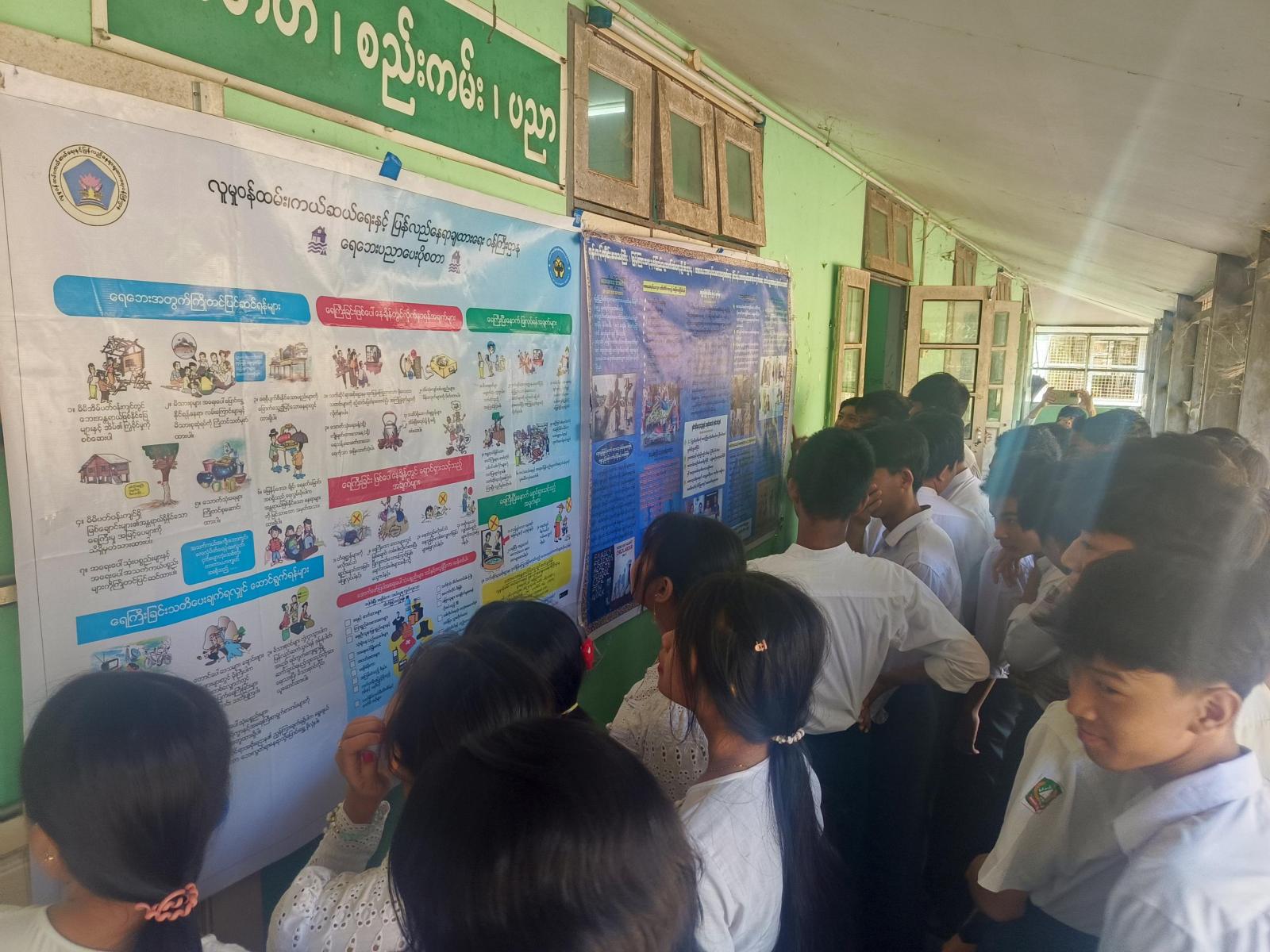 ထို့နောက် ကျောင်းသား/ကျောင်းသူများက ခရိုင်ပြန်ကြားရေးနှင့်ပြည်သူ့ဆက်ဆံရေးဦးစီးဌာန ဝန်ထမ်းများမှ ပြသထားသည် ကလေးအလုပ်သမားပပျောက်ရေး အသိပညာပေးနံရံကပ်စာစောင်များနှင့် ခင်းကျင်းပြသထားသည့် စာအုပ်စာစောင်များအား စိတ်ဝင်စားစွာ လေ့လာကြည့်ရှုခဲ့ကြကြောင်း သိရသည်။