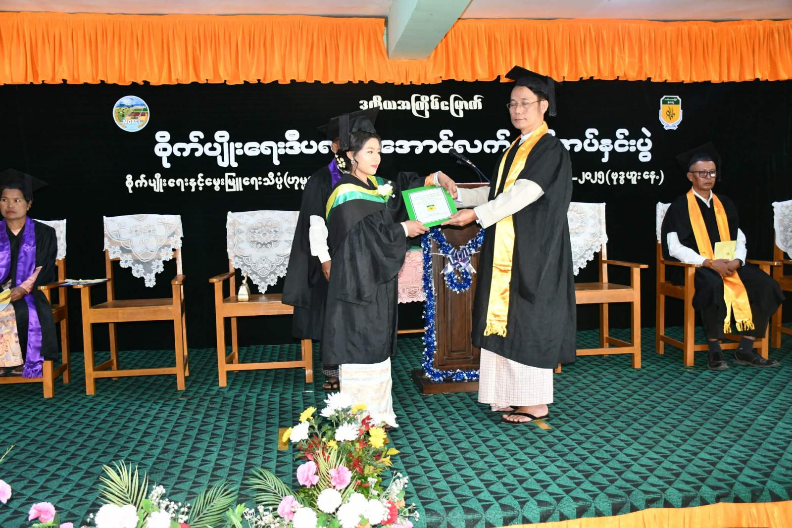 ဆက်လက်၍ ၂၀၂၄-၂၀၂၅ ပညာသင်နှစ်၊ စိုက်ပျိုးရေးဒီပလိုမာ ပြီးမြောက်သူများအား တန်းစဥ်ပေါင်းဆုများတွင် ပထမ၊ ဒုတိယ၊ တတိယဆုရရှိသူများကို စစ်ကိုင်းတိုင်းဒေသကြီးအစိုးရအဖွဲ့၊ တိုင်းရင်းသားရေးရာဝန်ကြီး ဦးစိုင်းလှိုင်ငြိမ်းက ဂုဏ်ပြုမှတ်တမ်းလွှာများအားပေးအပ်ချီးမြှင့်ခဲ့ပြီး တက်ရောက်လာသော အထူးဧည့်သည်တော်များနှင့် ဒီပလိုမာရမောင်မယ်များနှင့်အတူ အမှတ်တရ စုပေါင်းဓာတ်ပုံရိုက်ကူးခဲ့ကြကြောင်း သိရသည်။