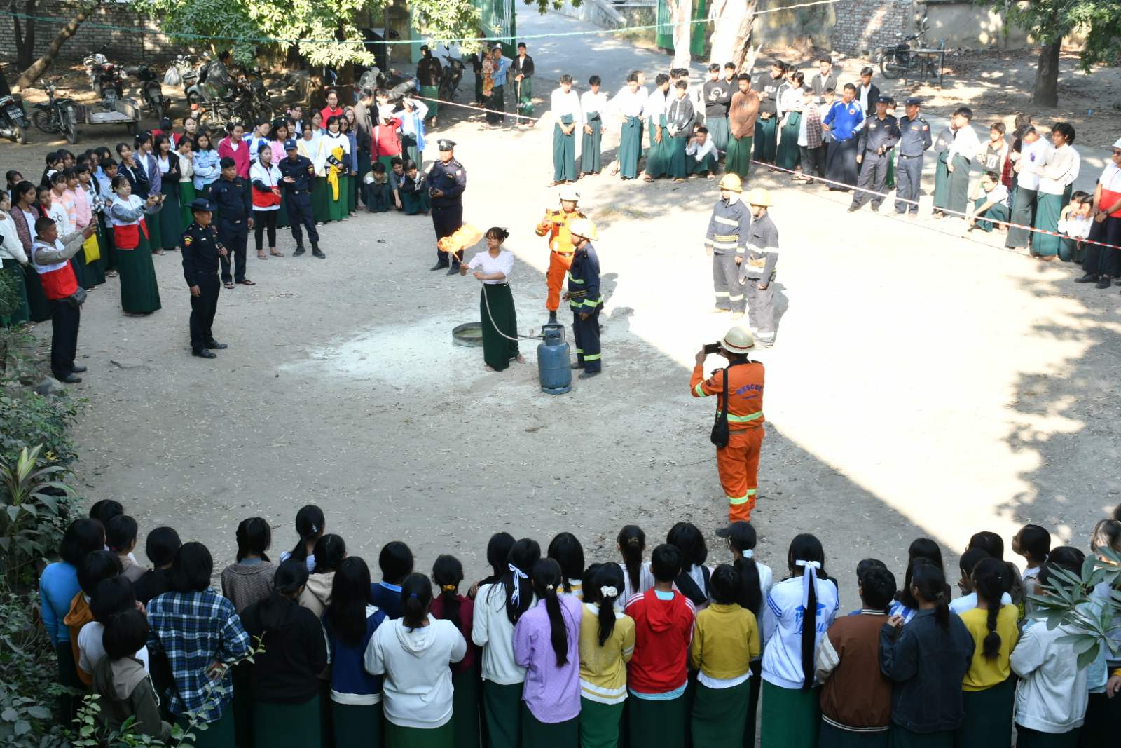 ထို့နောက် တက်ရောက်လာသည့် ကျောင်းသားကျောင်းသူများအား မီးသတ်ဦးစီးဌာနမှ ပြည်သူ့အကျိုးပြုလုပ်ငန်းများ၊ မီးဘေးအန္တရာယ်ကြိုတင်ကာကွယ်ရေးနှင့် သဘာဝဘေးလုပ်ငန်းများတွင် ပါဝင်ဆောင်ရွက်ခဲ့မှု စသည့်အကြောင်းများကို ပရိုဂျက်တာဖြင့် ရှင်းလင်းပြောကြားခဲ့သည်။ ဆက်လက်၍ အသိပညာပေး video clips များ ပြသ၍ လက်တွေ့မီးငြှိမ်းသတ်ခြင်း စသည်တို့အား ကျောင်းသား၊ ကျောင်းသူများ စိတ်ပါဝင်စားစွာဖြင့် ကိုယ်တိုင်သရုပ်ပြဆောင်ရွက်ခဲ့ကြပြီး၊ ငလျင်ပညာပေး ဇာတ်တိုက်သရုပ်ပြသခြင်းလည်း ပူးပေါင်းဆောင်ရွက်ခဲ့ကြသည်။