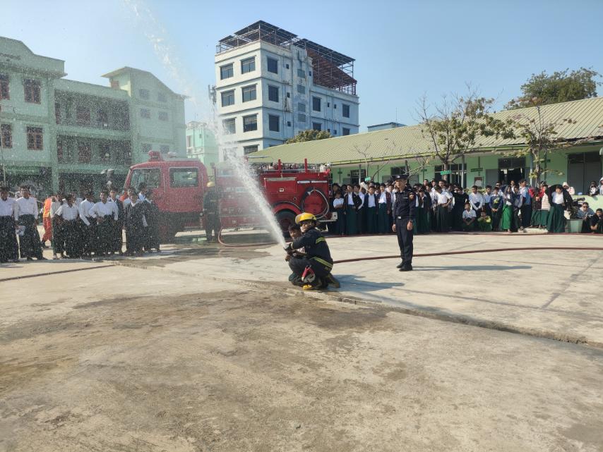 ရှေးဦးစွာ ချမ်းအေးသာစံမြို့နယ် မီးသတ်ဦးစီးမှူးရုံးမှ ဦးစီးအရာရှိ ဦးညီထွေးဦးက ဆရာ၊ ဆရာမများ၊ ကျောင်းသား၊ ကျောင်းသူများအား သဘာဝဘေးအန္တရာယ်ဆိုင်ရာ အသိပညာပေးအကြောင်းအရာများ ဟောပြောခြင်း၊ မီးငြှိမ်းသတ်ခြင်းနှင့် ရှာဖွေကယ်ဆယ်ရေး လက်တွေ့သရုပ်ပြခြင်းများကို ပြုလုပ်ခဲ့ကြသည်။