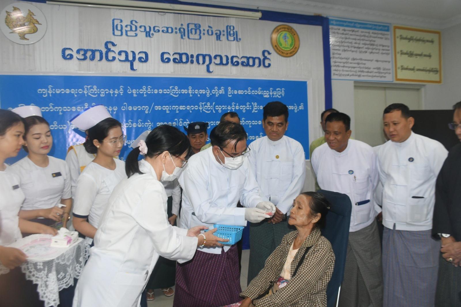 ရှေးဦးစွာ ပဲခူးတိုင်းဒေသကြီး ဝန်ကြီးချုပ် ဦးမျိုးဆွေဝင်းသည် သက်ကြီးဘိုးဘွားများအား သွားတု (အံကပ်) တပ်ဆင်ပေးခြင်းနှင့် နှုတ်ခမ်းကွဲ၊ အာခေါင်ကွဲလူနာများအား ခွဲစိတ်ကုသပြီးစီးသည့် ကလေးငယ်များအား လက်ဆောင်ပစ္စည်းများပေးအပ်ခဲ့သည်။ ၎င်းနောက် ပဲခူးတိုင်းဒေသကြီး ဝန်ကြီးချုပ် ဦးမျိုးဆွေဝင်းသည် အစိုးရအဖွဲ့ဝန်ကြီးများ၊ ပဲခူးတိုင်းဒေသကြီး ပြည်သူ့ကျန်းမာရေးနှင့်ကုသရေးဦးစီးဌာနမှူး ဒေါက်တာဇော်မင်းထွန်း၊ ဆေးရုံအုပ်ကြီး ဒေါက်တာဇော်လွင်တို့နှင့်အတူ ခွဲစိတ်ပြီးလူနာများနှင့် သွားတု (အံကပ်) တပ်ဆင်ပြီးစီးခဲ့သည့် သက်ကြီးဘိုးဘွားများအား ရင်းရင်းနှီးနှီး လိုက်လံနှုတ်ဆက်အားပေးစကားပြောကြားခဲ့သည်။