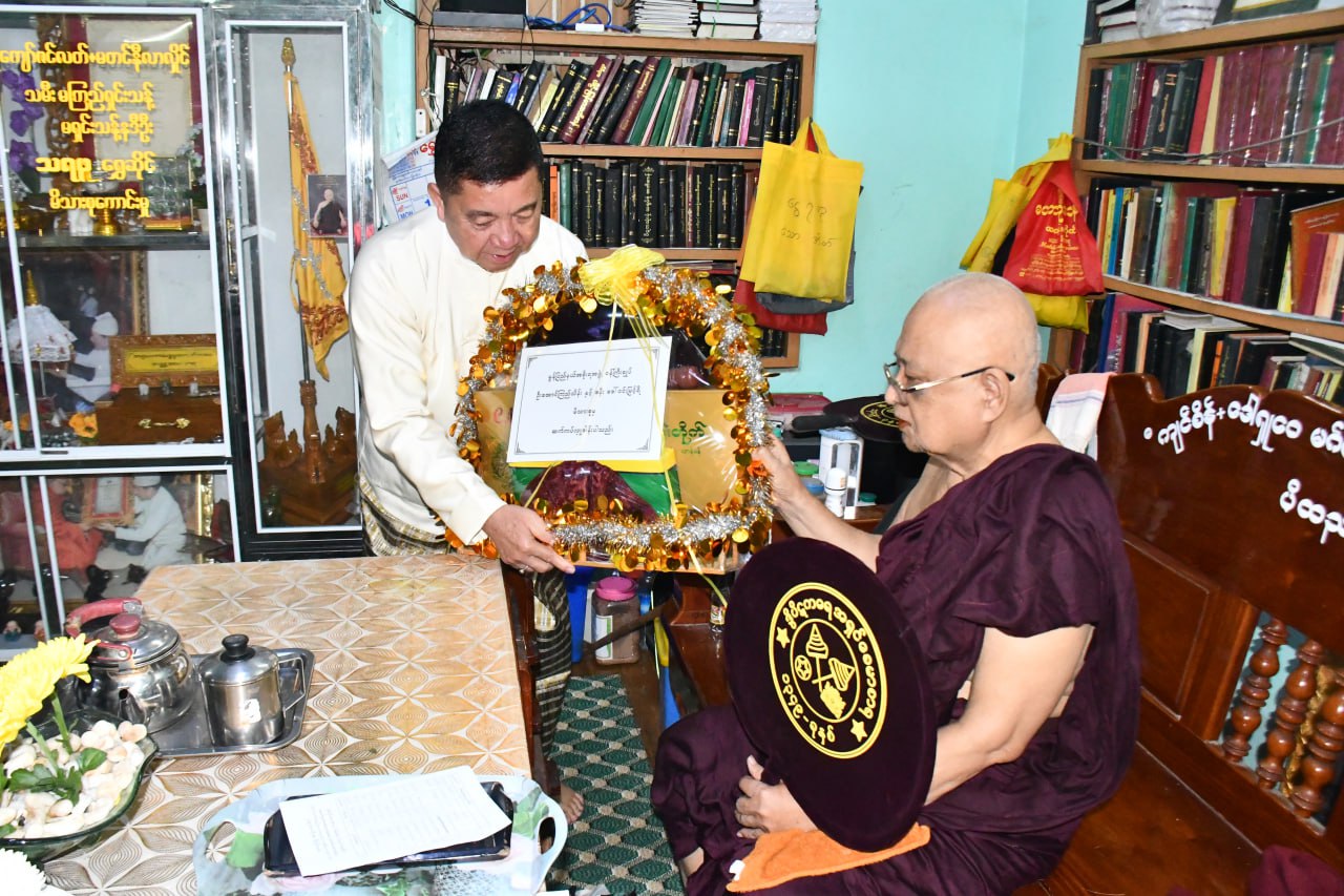 ဆက်လက်၍ ပြည်နယ်ဝန်ကြီးချုပ်နှင့်အဖွဲ့သည် မော်လမြိုင်မြို့၊ မြစေတီစာသင်တိုက်၊ ပဓာနမဟာနာယက မြဆရာတော်ဘုရားကြီး၏ အဘိဓဇမဟာရဋ္ဌဂုရု ဂုဏဝိသိဋ္ဌပူဇာမင်္ဂလာ အပူဇော်ခံဆရာတော်ကြီးများအား လှူဖွယ်ဝတ္ထုပစ္စည်းများ ဆက်ကပ်လှူဒါန်းပွဲ အခမ်းအနားသို့ တက်ရောက်ပြီး ဦးစွာအခမ်းအနားကို "နမောတဿ" သုံးကြိမ်ရွတ်ဆိုဘုရားကန်တော့ ဖွင့်လှစ်ခဲ့ပြီး မြဆရာတော်ဘုရားကြီးထံမှ ဧည့်ပရိသတ်အပေါင်းတို့က ငါးပါးသီလခံယူဆောက်တည်၍ ဩဝါဒတရားနာယူကာ မြဆရာတော် ဘုရားကြီးအား ပိုဒ်စုံရတုဖြင့် ချီးကျူးပူဇော်ခဲ့သည်။