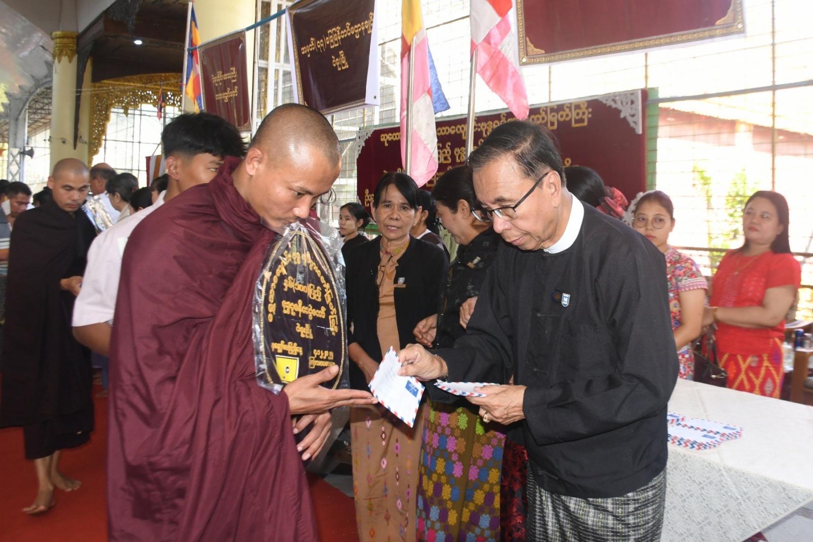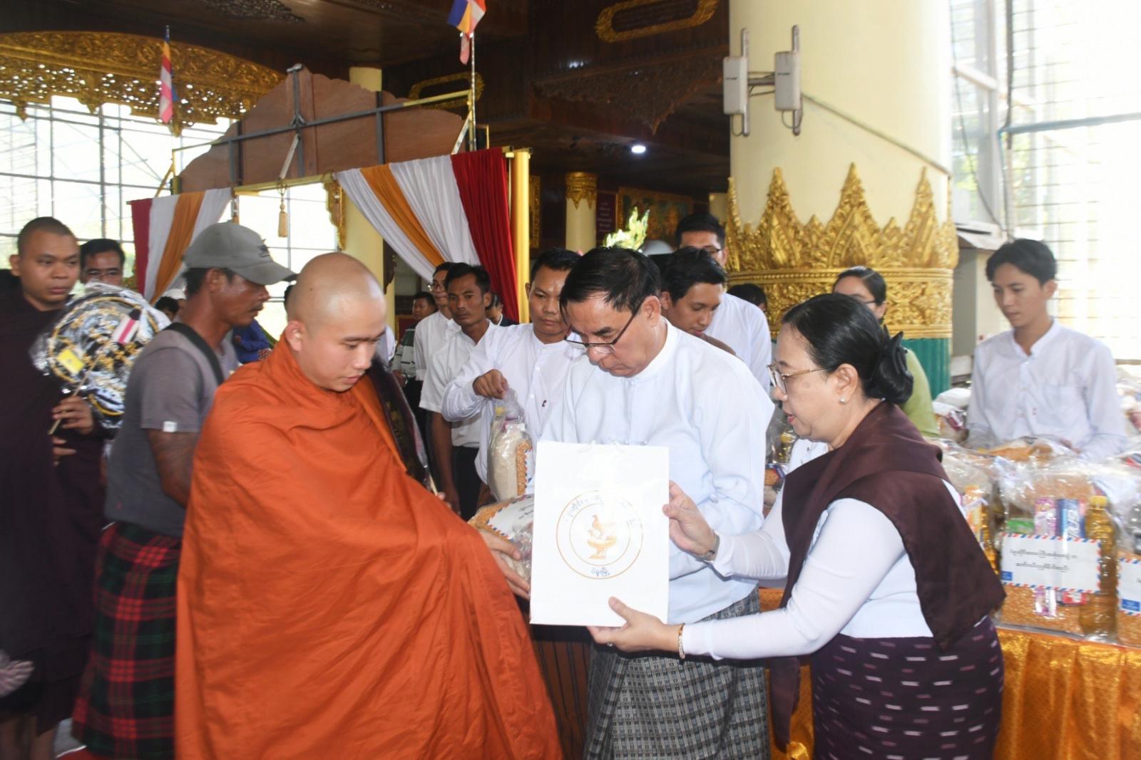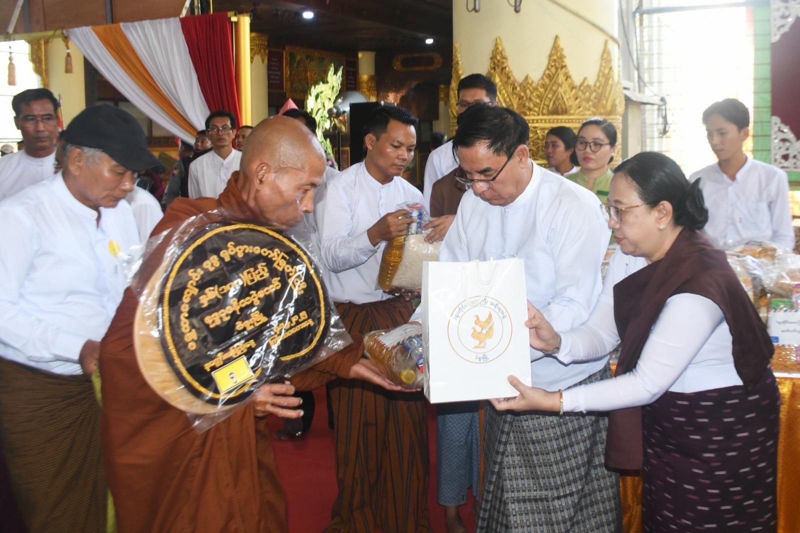 ထို့နောက် တိုင်းဒေသကြီး ဝန်ကြီးချုပ်နှင့် ဇနီး၊ တာဝန်ရှိသူများက ဆန်၊ ဆီ၊ ဆေးအပါအဝင် ပစ္စည်း (၁၈) မျိုးတို့အား ကြွရောက်လာသည့် သံဃာအပါး (၁၃၀)နှင့် သာသနာ့နွယ်ဝင် သီလရှင်ဆရာကြီးအပါး (၅၀) တို့အား လောင်းလှူပူဇော်ခဲ့ကြသည်။