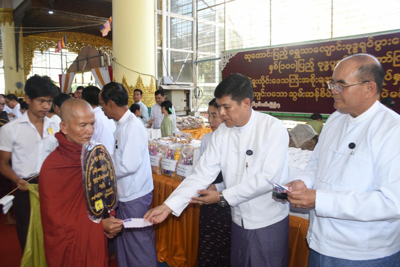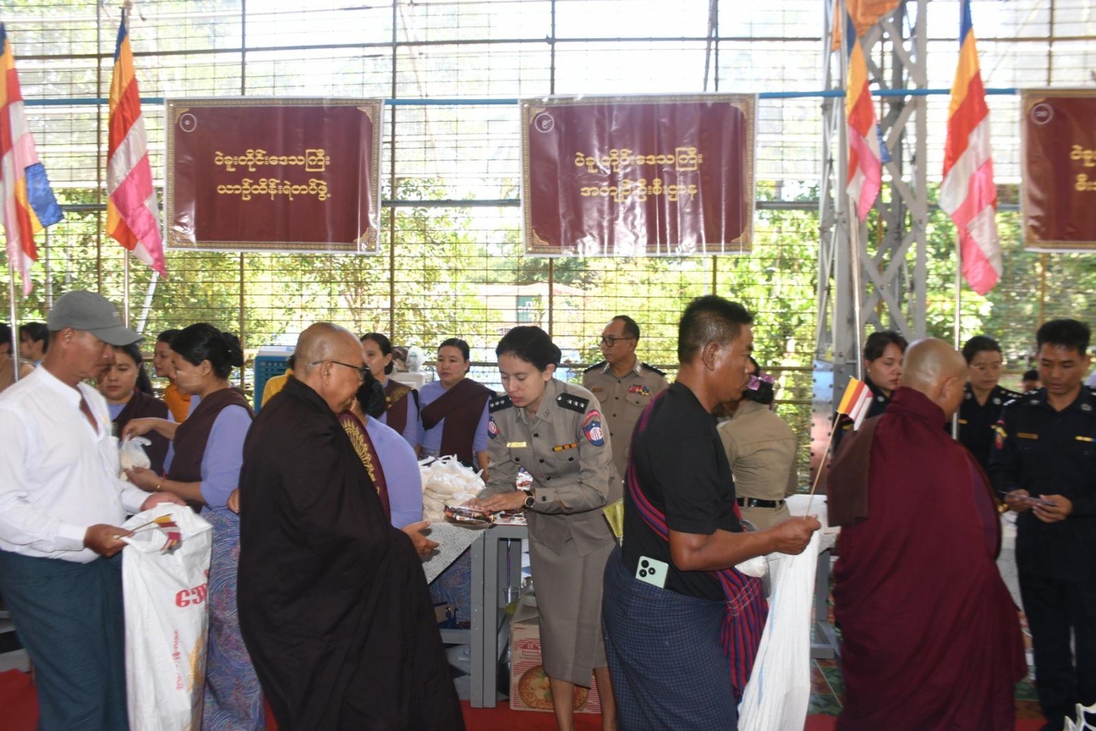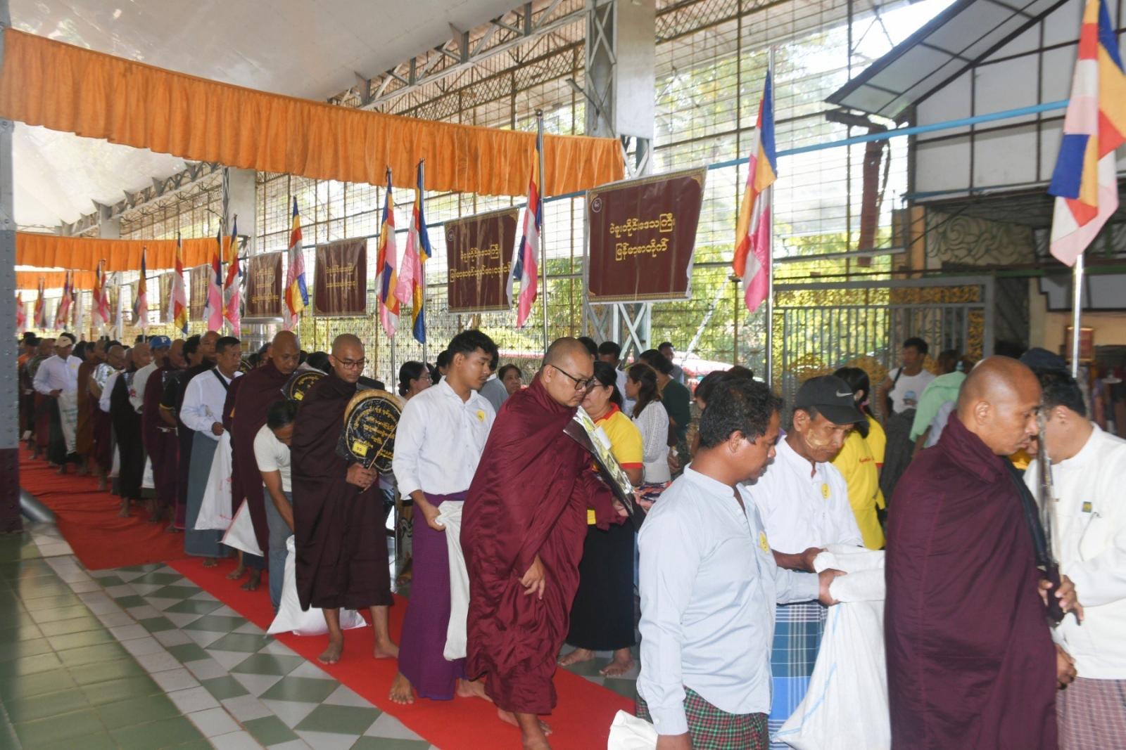 ထို့နောက် တိုင်းဒေသကြီး ဝန်ကြီးချုပ်နှင့် ဇနီး၊ တာဝန်ရှိသူများက ဆန်၊ ဆီ၊ ဆေးအပါအဝင် ပစ္စည်း (၁၈) မျိုးတို့အား ကြွရောက်လာသည့် သံဃာအပါး (၁၃၀)နှင့် သာသနာ့နွယ်ဝင် သီလရှင်ဆရာကြီးအပါး (၅၀) တို့အား လောင်းလှူပူဇော်ခဲ့ကြသည်။