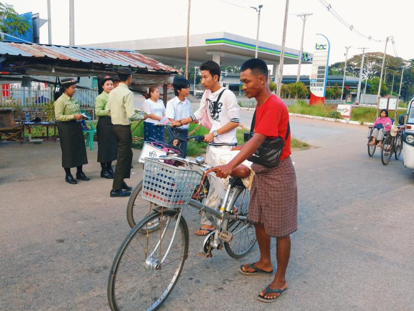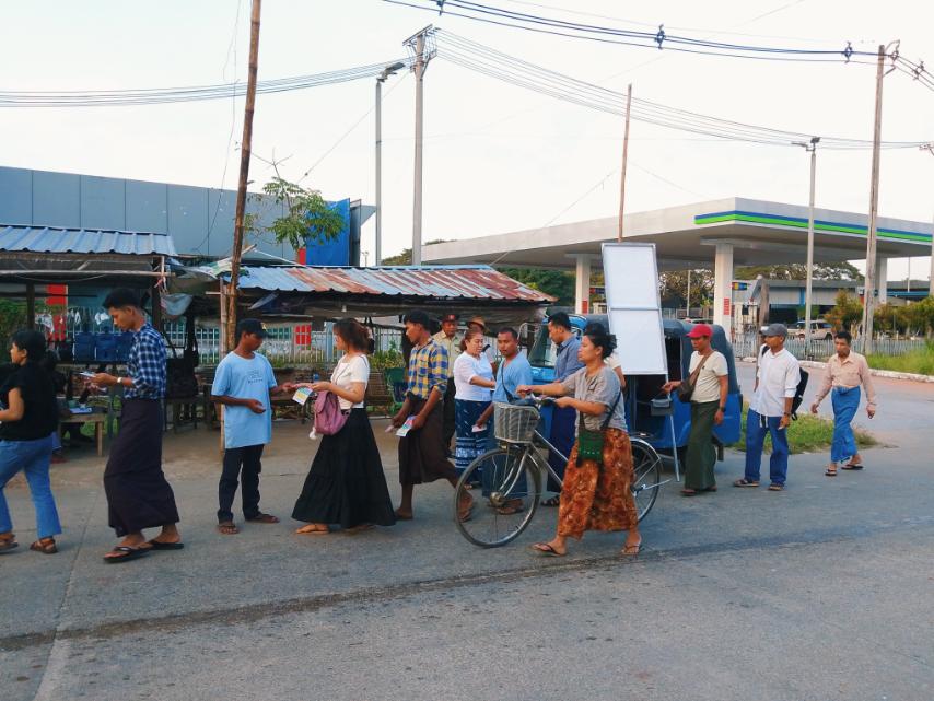 "ရွေးကောက်ပွဲမှသည် ပိုမိုကောင်းမွန်သောအနာဂတ်ဆီသို့" ဆောင်ပုဒ်နှင့်အညီ ဒီမိုကရေစီကို ပြန်လည်ဖော်ဆောင်ဖို့အတွက် ရွေးကောက်ပွဲမှလွဲ၍ အခြားနည်းမရှိပါ၊ ပြည်သူများ လိုလားသည့် ဒီမိုကရေစီနိုင်ငံတော်ကို ရွေးကောက်ပွဲဖြင့်သာ ဖော်ဆောင်နိုင်ပါသည်၊ ဒီမိုကရေစီခိုင်မြဲဖို့ မဲရုံသွားပြီး မဲပေးကြပါစို့၊ နိုင်ငံဖွံ့ဖြိုးတိုးတက်ဖို့ ဦးဆောင်နိုင်သူရွေးချယ်ကြပါစို့" စသည့်အကြောင်းအရာများ ပါဝင်သော လက်ကမ်းစာစောင်များအား မြို့နယ်အထွေထွေအုပ်ချုပ်ရေးဦးစီးဌာနမှ ဝန်ထမ်းများ၊ မြို့နယ်ပြန်ကြားရေးနှင့်ပြည်သူ့ဆက်ဆံရေးဦးစီးဌာန ဝန်ထမ်းများ၊ မြို့နယ်စည်ပင်သာယာမှ ၀န်ထမ်းများက ပြည်သူများ လက်ဝယ်အရောက်ဖြန့်ဝေပေးခဲ့သည်။
