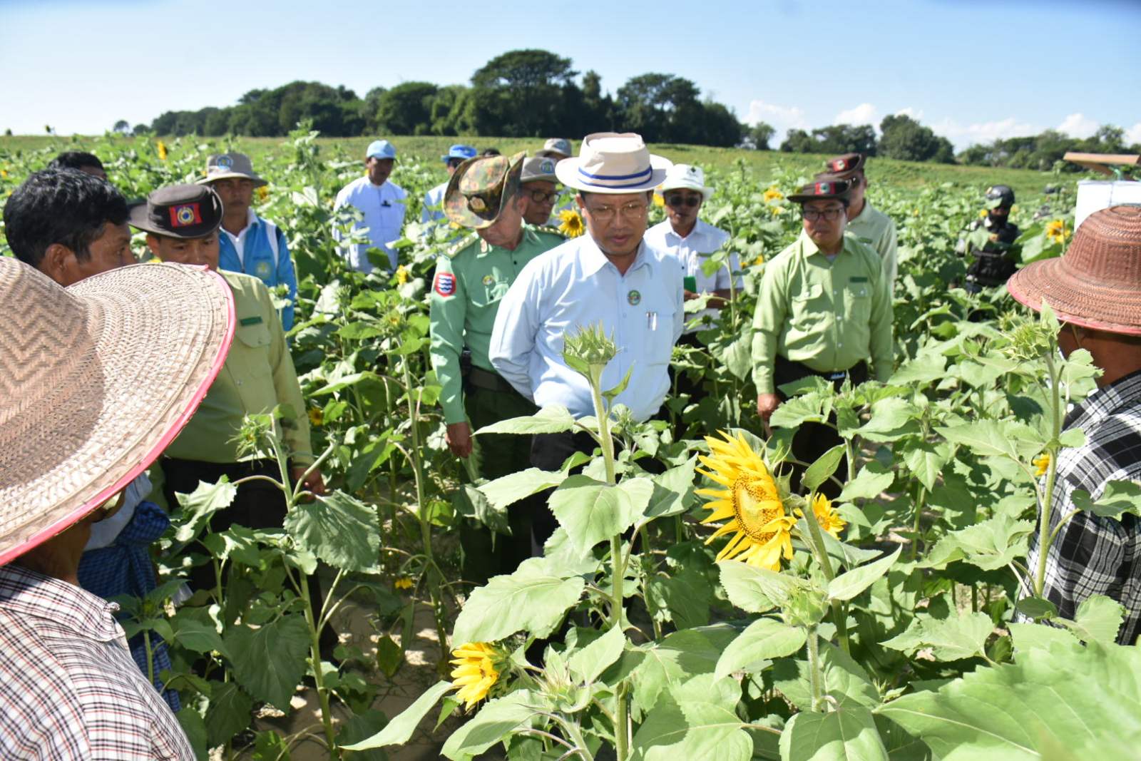 ထို့နောက် တိုင်းဒေသကြီးဝန်ကြီးချုပ်နှင့်အဖွဲ့သည် မြန်အောင်မြို့နယ်၊ ကညင်ငူကျေးရွာအုပ်စု၊ ရေကျော်ကုန်းကျေးရွာ တောင်သူဦးသန်းဇော်ဦး၏ စိုက်ဧက(၅)ဧကတွင် စိုက်ပျိုးထားသည့် Super Sun-41 နေကြာစိုက်ခင်းအား စနစ်တကျရေပေးခြင်းလုပ်ငန်းဆောင်ရွက်နေမှုများကို ကြည့်ရှုအားပေးပြီး ပိုးမွှားများမကျရောက်စေရေး ကြိုတင်ကာကွယ်ဆောင်ရွက်ကြရန်နှင့် မြေသြဇာကျွေးခြင်းလုပ်ငန်းများကိုလည်း စနစ်တကျဆောင်ရွက်စေရေးနှင့် အောင်မြင်ဖြစ်ထွန်းအောင် ဆောင်ရွက်စေရေး မှာကြားခဲ့သည်။