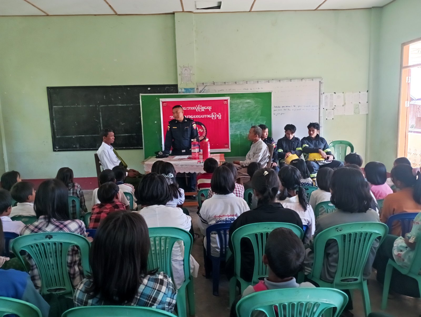 ရှေးဦးစွာ မြို့နယ်မီးသတ်ဦးစီးမှူး ဦးရှိန်းမင်းထက်၏ကြီးကြပ်မှုဖြင့် ဒုတိယဦးစီးမှူး ဦးသိန်းလင်းနိုင်က မီးဘေးအန္တရာယ် ကြိုတင်ကာကွယ်ရေးလုပ်ငန်းများနှင့်ပတ်သက်၍ အသိပညာပေးဟောပြောပြီး မီးငြှိမ်းသတ်ခြင်းအား မြို့နယ်မီးသတ်တပ်ဖွဲ့ဝင်များက လက်တွေ့သရုပ်ပြသ၍ခြင်းများ ပြုလုပ်ခဲ့သည်။