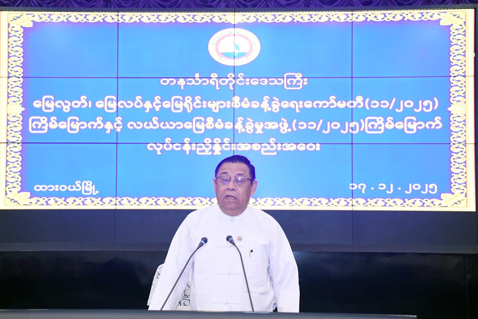 အစည်းအဝေးတွင်တိုင်းဒေသကြီး မြေလွတ်၊ မြေလပ်နှင့် မြေရိုင်းများ စီမံခန့်ခွဲရေးကော်မတီနှင့် လယ်ယာမြေစီမံခန့်ခွဲမှုအဖွဲ့ဥက္ကဋ္ဌ တိုင်းဒေသကြီးဝန်ကြီးချုပ် ဦးမြတ်ကိုက မြေလွတ်၊ မြေလပ်နှင့် မြေရိုင်းများ စီမံခန့်ခွဲရေးကော်မတီနှင့်လယ်ယာမြေစီမံခန့်ခွဲမှုအဖွဲ့ လုပ်ငန်းညှိနှိုင်းအစည်းအဝေးကို လစဉ်ပုံမှန်ပြုလုပ်လျက်ရှိကြောင်း၊ တိုင်းဒေသကြီးအတွင်းလယ်ယာမြေနှင့်ပတ်သက်၍ ဒေသအတွင်း ဖွံ့ဖြိုးတိုးတက်ရေးအတွက် ဆောင်ရွက်ရမည့်လုပ်ငန်းများ၊ စီးပွားရေးလုပ်ငန်း ဆောင်ရွက်ရမည့်ကိစ္စရပ်များ စသဖြင့်လုပ်ငန်းများကို တိုင်းဒေသကြီးအစိုးရ အဖွဲ့အနေဖြင့် စိစစ်၍ ဆောင်ရွက်ပေးထားသည်များရှိကြောင်း၊ အထူးသဖြင့် အခြားနည်းသုံးစွဲသည့်နေရာတွင် တိုင်းဒေသကြီးအတွင်း ဖွံ့ဖြိုးတိုးတက်လာမည့် MSME လုပ်ငန်းလုပ်ကိုင် ဆောင်ရွက် ထားရှိမှုများရှိကြောင်း၊ တိုင်းဒေသကြီးဖွံ့ဖြိုးတိုးတက်ရေးအတွက် ဝဥစက်ရုံဆောက်လုပ်ရန်ဆောင်ရွက် ထားရှိကြောင်း၊ တိုင်းဒေသကြီး၌ ဥယျာဉ်မြေ များပြားကြောင်း၊ လယ်ယာမြေများသုံးစွဲသည့်နေရာတွင် အထင်မြင်လွဲမှားမှုများ ဖြစ်ပေါ်နိုင်သည့်အတွက် သက်ဆိုင်ရာတာဝန်ရှိသူများက ဥပဒေနှင့်အညီ စိစစ်ကြပ်မတ်ဆောင်ရွက်ပေးကြရန် လိုအပ်ကြောင်း၊ လယ်ယာမြေနှင့်ပတ်သက်၍ တက်ရောက်လာကြသူများက ဝိုင်းဝန်းအကြံပြုဆွေးနွေးပေးကြရန် လိုအပ်ကြောင်း ပြောကြားသည်။