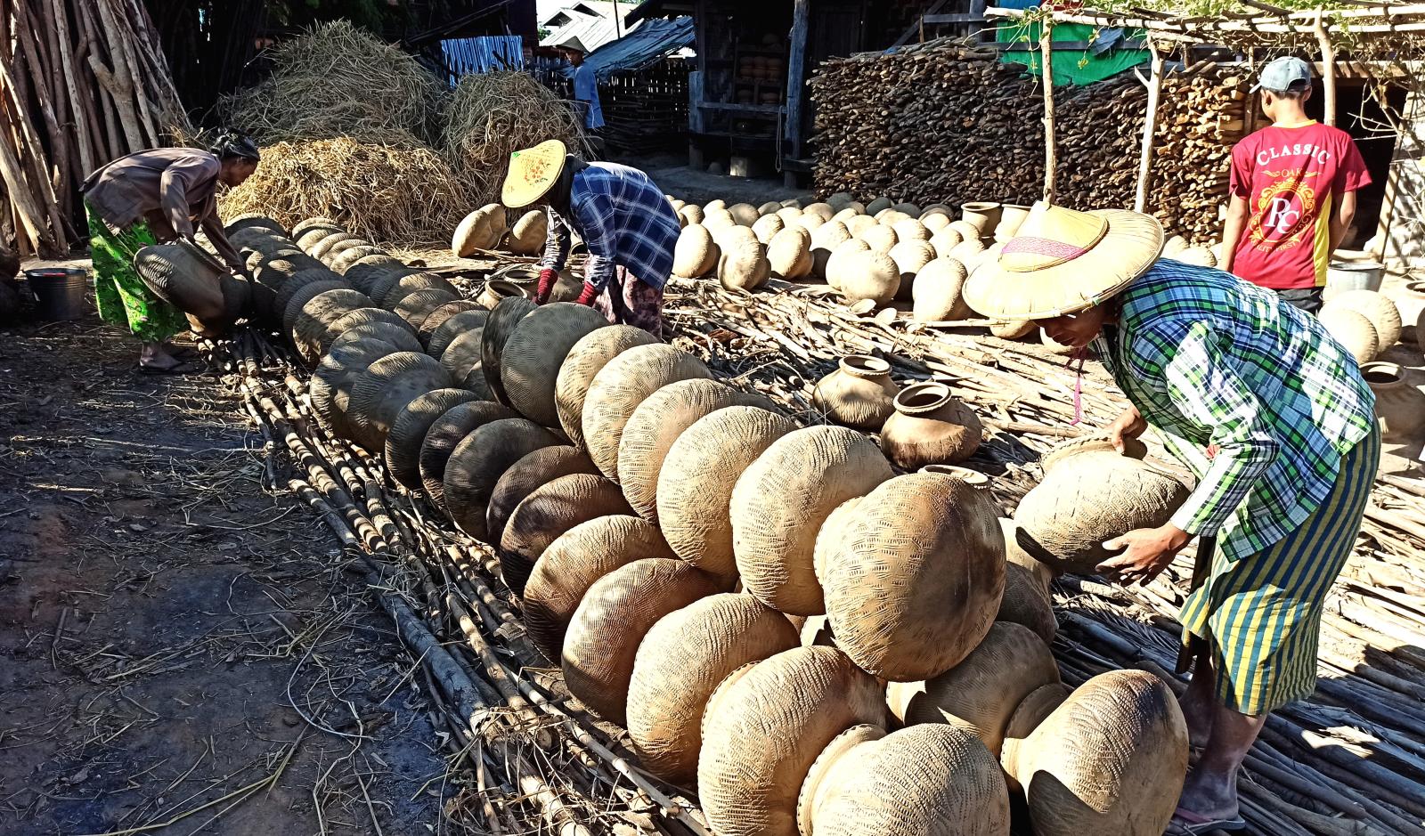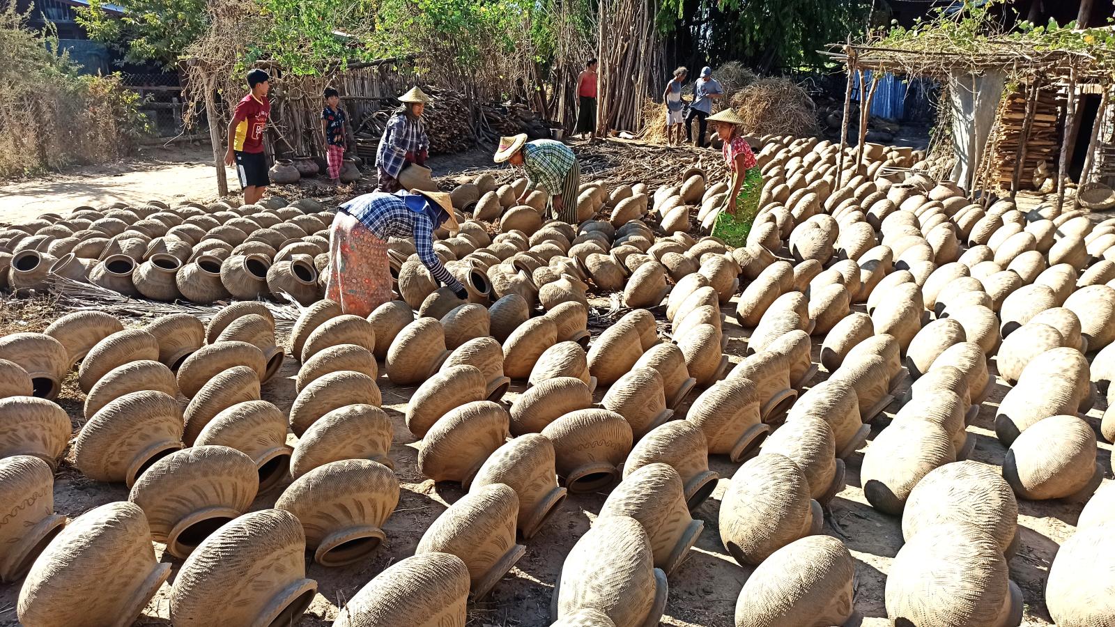 “ကျွန်တော်တို့ ကျေးရွာမှာ စိုက်ပျိုးရေးလုပ်ငန်းအပြင် အိုးလုပ်ငန်းကို မိဘများလက်ထက်က လက်ဆင့်ကမ်းလုပ်ကိုင်ကြပါတယ်။ အိုးလုပ်ရာမှာ အဓိကကုန်ကြမ်းဖြစ်တဲ့ ရွံ့မြေနဲ့ သဲကို ဒေသတွင်းကရရှိပြီး ကြိုတင်စုဆောင်းထားရပါတယ်။ အိုးတစ်လုံးဖြစ်ဖို့ ရွံ့မြေနဲ့ သဲကို အချိုးကျရောစပ်ပြီး ရေစိမ်ထားရပါတယ်။ ရေစီမ်ထားတဲ့မြေကိုနင်း၊ ပုံလောင်း၊ ထုတ်နဲ့သုံးဆင့်ရိုက် နေလှန်းပြီး မီးဖုတ်ရပါတယ်” ဟု အိုးလုပ်ငန်းလုပ်ကိုင်သူ ဦးချိုလေးက ပြောသည်။