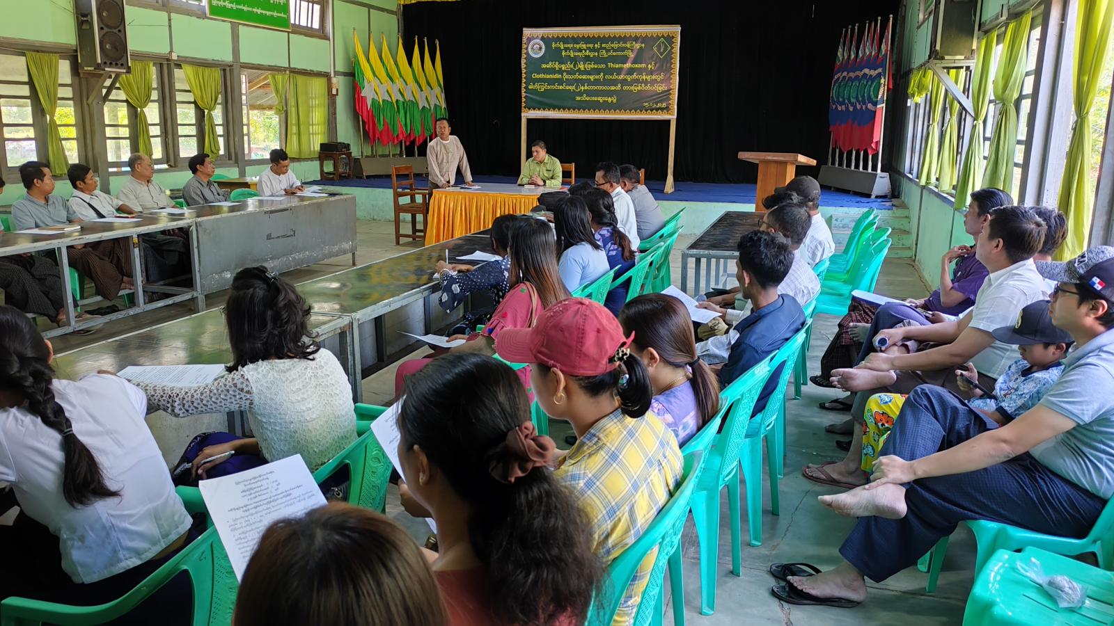 ရှေးဦးစွာ မြို့နယ်စီမံခန့်ခွဲရေးနှင့်အုပ်ချုပ်ရေးကော်မတီဥက္ကဋ္ဌ ဦးအောင်ဇော်မင်းက အဖွင့်အမှာ စကားပြောကြားပြီး မြို့နယ်စိုက်ပျိုးရေးဦးစီးဌာန မြို့နယ်ဦးစီးမှူး ဦးမောင်မောင်ဌေးက အဆိပ်ရှိပစ္စည်း(၂)မျိုးဖြစ်သော Thiamethoxam နှင့် Clothianidin ပိုးသတ်ဆေးများသည် လယ်ယာထွက်ကုန်များတွင် ပြည်ပပို့ကုန်များနှင့် စားသုံးသူပြည်သူများ ထိခိုက်နိုင်သော ဓာတ်ကြွင်းကျန်ရှိမှုများသောကြောင့် အဆိုပါပိုးသတ်ဆေးအား ရောင်းချခြင်းမပြုရန်နှင့် အမိန့်ညွှန်ကြးချက်အား လိုက်နာဆောင်ရွက်ခြင်းမရှိပါက ပိုးသတ်ဆေးဥပဒေအရ အရေးယူခံရမည်ဖြစ်ကြောင်း တောင်သူများ၏ စိုက်ပျုးသီးနှံများ ပန်းတိုင်အထွက်နှုန်းရရှိရေး ဘေးအန္တရာယ်ကင်းရှင်းပြီး အရည်အသွေးပြည့်မီသော သီးနှံများရရှိရေးတို့အတွက် စံချိန်စံညွှန်းနှင့် ကိုက်ညီသော မြေဩဇာ ပိုးသတ်ဆးများကိုသာ ရောင်းချသွားရန် အသိပညာပေးဆွေးနွေးခဲ့သည်။