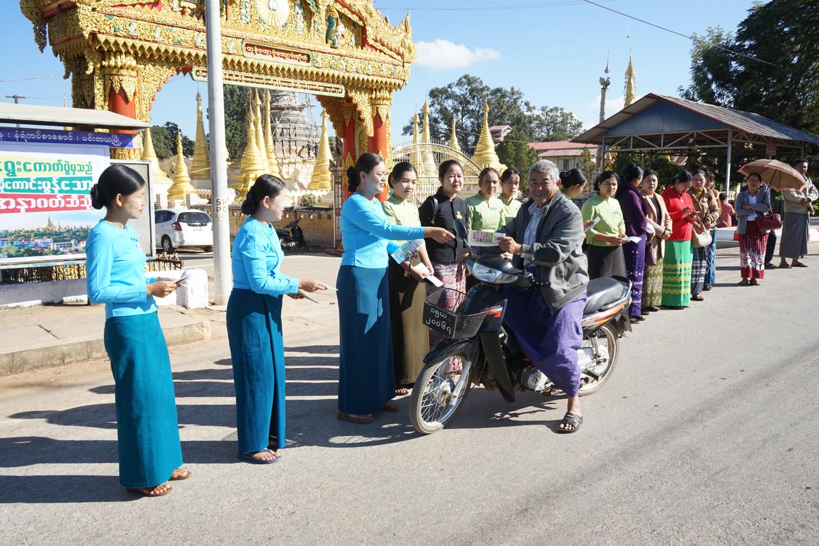 ထို့နောက် လမ်းဘေးဝဲယာတစ်လျှောက် ခရီးသွားပြည်သူများ၊ ဈေးရောင်း၊ ဈေးဝယ် လာကြသူများအား ဒို့အတူတူမဲပေးကြမယ်၊ ရွေးကောက်ပွဲမှသည် ပိုမိုကောင်းမွန်သော အနာဂတ်ဆီသို့ စသည့်ရွေးကောက်ပွဲဆိုင်ရာ ရွေးကောက်ပွဲလှုံ့ဆော်ရေး အသိပညာပေး လက်ကမ်းစာစောင်များကို အခမဲ့ဖြန့်ဝေပေးခဲ့ကြောင်း သိရသည်။