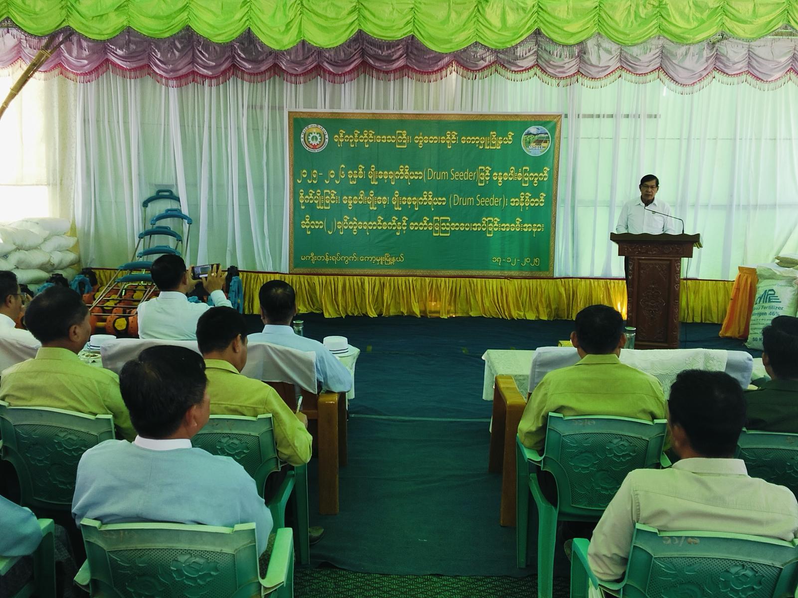 ထို့နောက် ရန်ကုန်တိုင်းဒေသကြီးအစိုးရအဖွဲ့ ဝန်ကြီးချုပ် ဦးစိုးသိန်းက လမ်းညွှန်အမှာစကားပြောကြားခဲ့ပြီး ဝန်ကြီးချုပ် ဦးစိုးသိန်း၊ တိုင်းဒေသကြီးအစိုးရအဖွဲ့ဝင်ဝန်ကြီးများက နွေစပါးမျိုးစေ့၊ မျိုးစေ့ချကိရိယာ Drum Seeder ၊အနိမ့်တင်ဆိုလာ (၂) ချပ်တွဲရေတင်စက်နှင့် ဓာတ်မြေဩဇာများအား တာဝန်ရှိသူများနှင့် တောင်သူများထံ ပေးအပ်ခဲ့ကြကြောင်း သိရသည်။