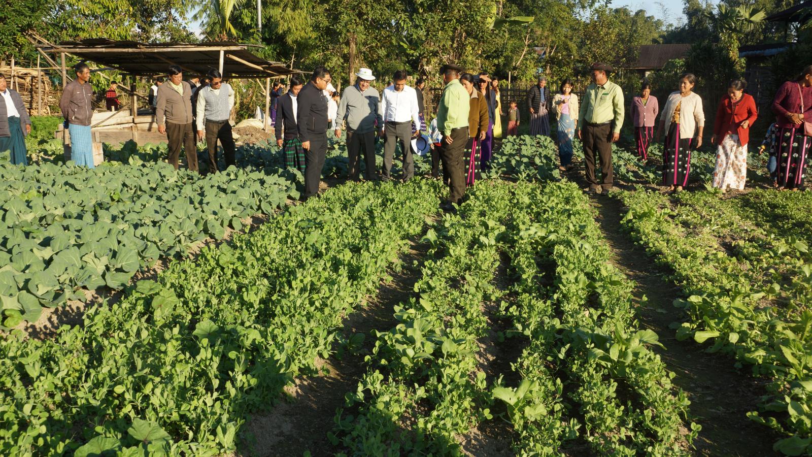 ထို့နောက် ပြည်နယ်ဝန်ကြီးချုပ်နှင့်အဖွဲ့ဝင်များသည် အဆိုပါရပ်ကွက်အတွင်း မိသားစု တစ်ပိုင်တစ်နိုင် စိုက်ပျိုးလုပ်ငန်းမှတစ်ဆင့် ဒေသတွင်းဈေးကွက်၌ ရောင်းချ၍ စီးပွားဖြစ်ထွန်းလာ စေရေး နိုင်ငံ့စီးပွားမြှင့်တင်ရေး ရန်ပုံငွေမတည်ပေးဖြင့် အကျိုးဖြစ်ထွန်းလျက်ရှိသော တောင်သူ ဦးရွှေဘုံ၏ နေအိမ်ခြံဝင်းအတွင်း ဆောင်းသီးနှံများဖြစ်သည့် မုန်ညှင်း၊ ပန်းမုန်လာ၊ အာလူး၊ မုန်လာထုပ်၊ ခရမ်းချဉ်သီး စသည့် ဟင်းသီးဟင်းရွက်အမယ်မျိုးစုံ စိုက်ပျိုးထားရှိမှု အခြေအနေများ ကိုလှည့်လည်ကြည့်ရှုစစ်ဆေးပြီး စိုက်ပျိုးရေးလုပ်ငန်းများနှင့်စပ်လျဉ်း၍ လိုအပ်သည့် မျိုးကောင်း မျိုးသန့်နှင့် စိုက်ပျိုးရေနှင့် သွင်းအားစုများ လုံလောက်စွာရရှိရေး ဌာနဆိုင်ရာတာဝန်ရှိသူများနှင့် ညှိနှိုင်းပေါင်းစပ်ဆောင်ရွက်ပေးခဲ့သည်။