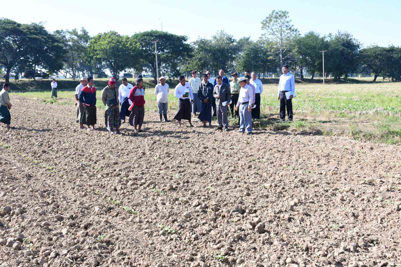 နေပြည်တော်ကောင်စီဥက္ကဋ္ဌ ဦးသန်းထွန်းဦးသည် ယမန်နေ့နံနက်ပိုင်းက ပုဗ္ဗသီရိမြို့နယ် ဘဲကုန်းကျေးရွာရှိ ကွင်းအမှတ် (၁၆၂၃ (က))ရှိ တောင်သူဦးဌေးအောင်၏ ဆောင်းသီးနှံ နေကြာငါးဧက စိုက်ပျိုးထားရှိမှုအခြေအနေနှင့်သီးနှံများစိုက်ပျိုးရေလုံလောက်စွာ ရရှိရေး ဆည်မြောင်းနှင့်ရေအသုံးချမှုစီမံခန့်ခွဲရေးဦးစီးဌာနမှ ဆောင်ရွက်ထားရှိသည့် အနိမ့်တင် ဆိုလာရေတင်စနစ် ဆောင်ရွက်ထားရှိမှုကို ကြည့်ရှုစစ်ဆေးကာ ကြည့်ရှုစစ်ဆေးပြီး သီးနှံများရာသီပြည့်စိုက်ပျိုးနိုင်ရေး၊ ပန်းတိုင်အထွက်နှုန်းရရှိရေး၊ မျိုး၊ မြေ၊ ရေ၊ နည်း စိုက်စနည်းစနစ်မှန်ကန်စေရေးနှင့် သဘာဝမြေဩဇာကို နည်းစနစ်အတိုင်းအပြည့်အဝဖြည့်တင်းပေးရေးတို့ကို မှာကြားသည်။