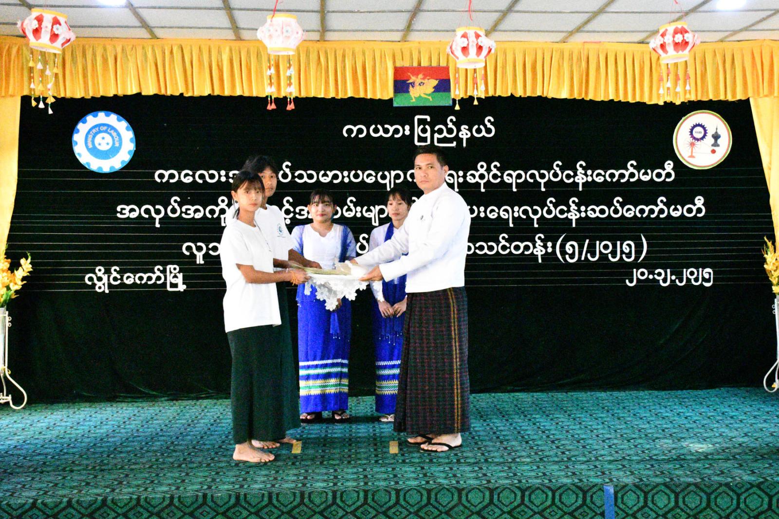 ဦးစွာကယားပြည်နယ် ကလေးအလုပ်သမားပပျောက်ရေးဆိုင်ရာ အလုပ်အကိုင်အခွင့်အလမ်းများ ဖန်တီးပေးရေးဆပ်ကော်မတီအတွင်းရေးမှူး၊ အလုပ်သမားညွှန်ကြားရေးဦးစီးဌာန ညွှန်ကြားရေးမှူး ဦးသူရိန်လင်းက သင်တန်းဖွင့်လှစ်ရခြင်း ရည်ရွယ်ချက်များကို ရှင်းလင်းပြောကြားပြီး အသေးစားစက်မှုလက်မှုလုပ်ငန်းဦးစီးဌာန ညွှန်ကြားရေးမှူး ဦးလင်းထွဋ်မိုးက သင်တန်းတွင်သင်ကြားမည့် ဘာသာရပ်များအား ရှင်းလင်းပြောကြားသည်။