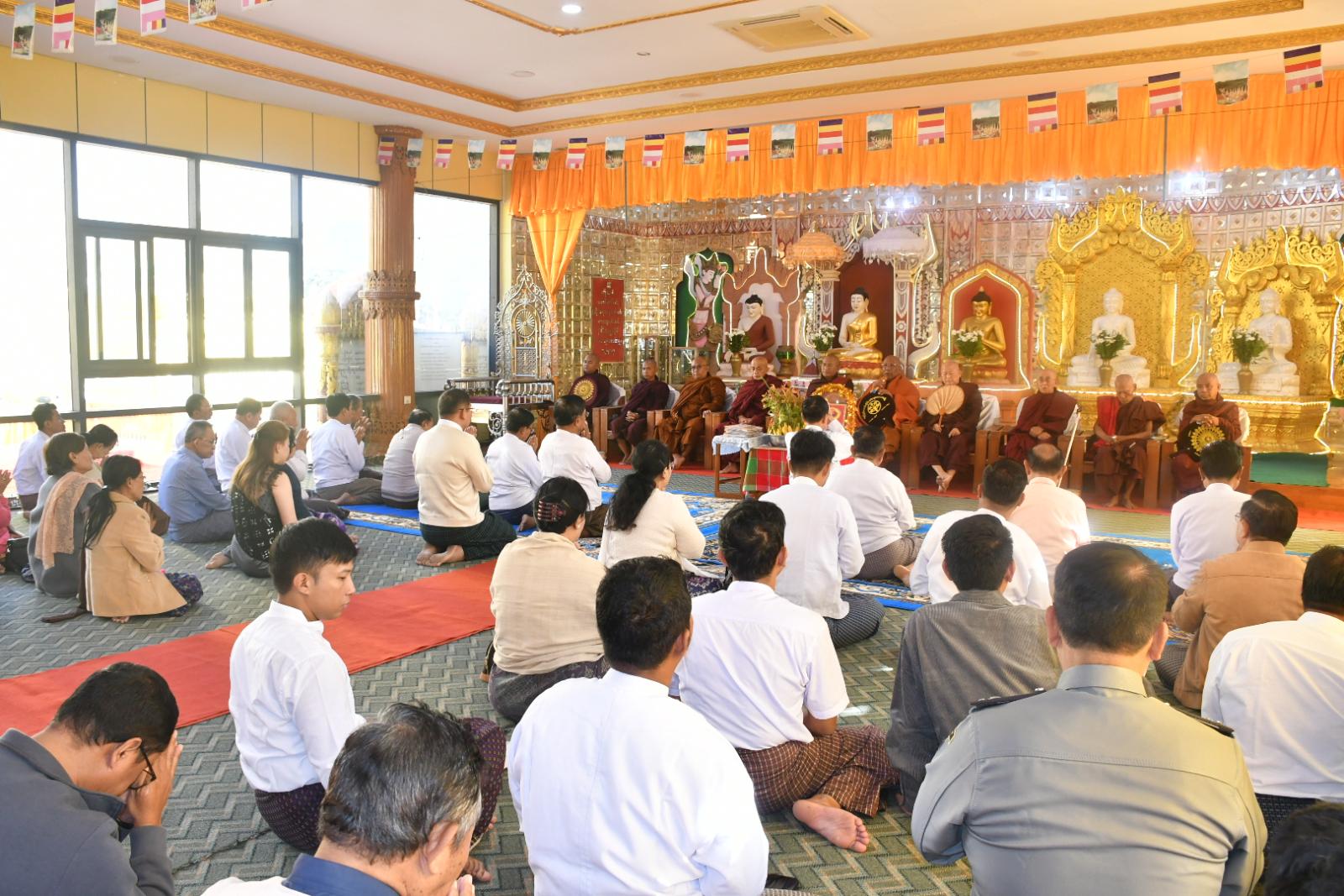 ဦးစွာ ဆရာတော်သံဃာတော်များက ဘုရားအနေကဇာတင်လှူပူဇော်ခဲ့ပြီး အခမ်းအနားကိုဆက်လက်ကျင်းပရာ အခမ်းအနားကို နမောတဿသုံးကြိမ်ရွတ်ဆို ဘုရားကန်တော့၍ ဖွင့်လှစ်ခဲ့ပြီး ဆရာတော်သံဃာတော်များထံမှ တက်ရောက်လာကြသူများမှ ငါးပါးသီလခံယူဆောက်တည်ခြင်း၊ ဆရာတော်များမှ ပရိတ်တရားတော်များချီးမြှင့်ပေးခြင်းဆောင်ရွက်ခဲ့ပြီး ဆရာတော်များထံ နေပြည်တော်ကောင်စီဥက္ကဋ္ဌ ဦးသန်းထွန်းဦးနှင့်တာဝန်ရှိသူများက သင်္ကန်းနှင့် လှူဖွယ်ဝတ္ထုပစ္စည်များဆက်ကပ်ခဲ့ကြပြီး အလှူရှင်များအားဂုဏ်ပြုမှတ်တမ်းများပေးအပ်ခဲ့ကြောင်း၊ ဆရာတော်များထံ ဘုရားကိုးဆူဂေါပကအဖွဲ့ဥက္ကဋ္ဌ ဦးစိုးတင့်က သာသနာရေးဆိုင်ရာကိစ္စရပ်များ လျှောက်တင်ခဲ့ပြီး ဆရာတော်ဘဒ္ဒန္တ ကုသလထံမှ ရေစက်ချတရားနာယူခဲ့ပြီး နေပြည်တော်ကောင်စီဥက္ကဋ္ဌနှင့်တာဝန်ရှိသူများက ဆရာတော်သံဃာတော်များအား နေ့ဆွမ်း ဆက်ကပ်လှူဒါန်းခဲ့သည်။