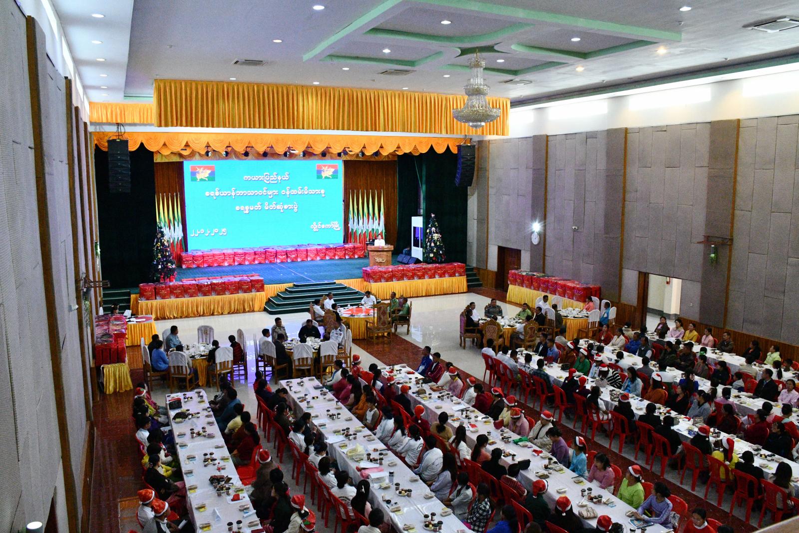 ကယားပြည်နယ်အစိုးရအဖွဲ့မှ ကြီးမှူး၍ ၂၀၂၅ ခုနှစ် ဝန်ထမ်းမိသားစု ခရစ္စမတ်မိတ်ဆုံ စားပွဲ အခမ်းအနားကို ယနေ့မွန်းလွဲပိုင်းက လွိုင်ကော်မြို့ ပြည်နယ်ခန်းမ၌ ကျင်းပရာ ပြည်နယ်ဝန်ကြီးချုပ် ဦးဇော်မျိုးတင်၊ ဒေသကွပ်ကဲရေးမှူး၊ ပြည်နယ်တရားသူကြီးချုပ်၊ ပြည်နယ်အစိုးရအဖွဲ့ဝင်များ၊ ဌာနဆိုင်ရာများမှ ခရစ်ယာန်ဘာသာဝင်ဝန်ထမ်းများ တက်ရောက်ကြသည်။