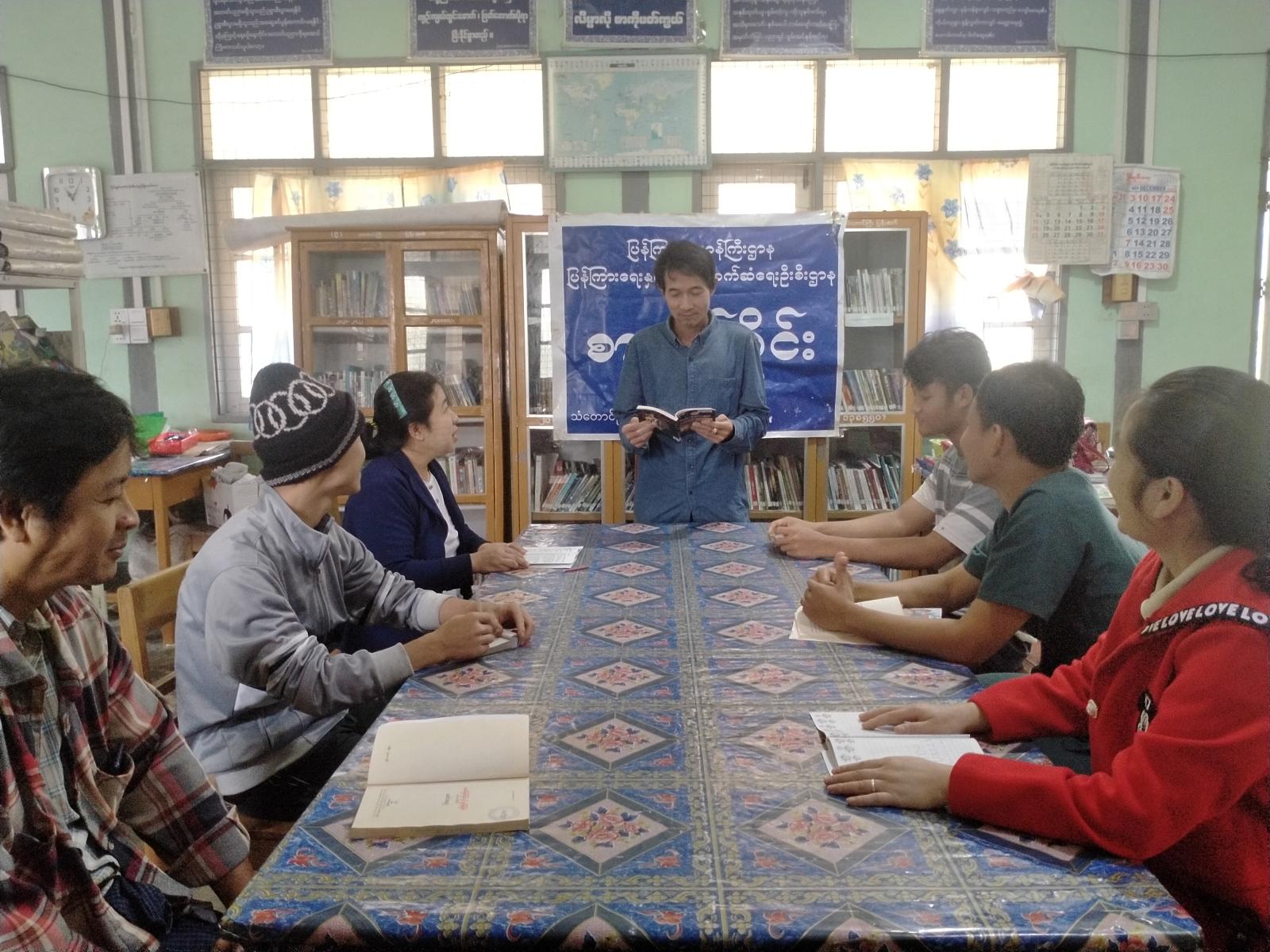 ကရင်ပြည်နယ် သံတောင်ကြီးမြို့နယ်တွင် စာဖတ်ခြင်းအကျိုးကျေးဇူးသိရှိစေရန် ရည်ရွယ်၍ Book Club/ Youth Club အဖွဲ့ဝင်များက စာရေးဆရာဖေမြင့်၏ ခေါင်းဆောင်စိတ် ခေါင်းဆောင်အတွေး စာအုပ်အား ယမန်နေ့နေ့လည် (၁) နာရီက Community Centre ခန်းမ၌ စာဖတ်ဝိုင်းဆွေးနွေးပွဲ ဆောင်ရွက်ခဲ့ကြောင်း သိရသည်။