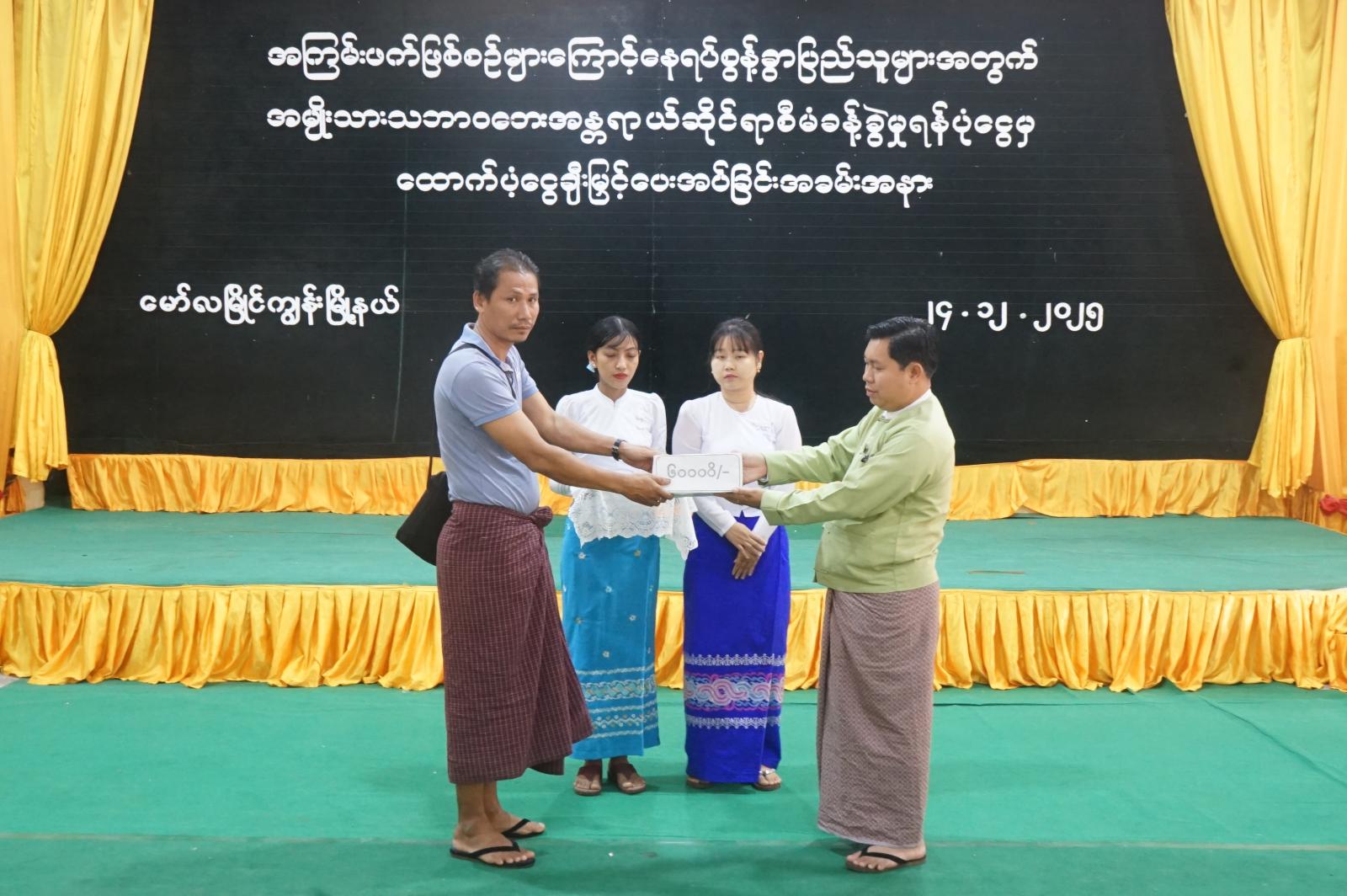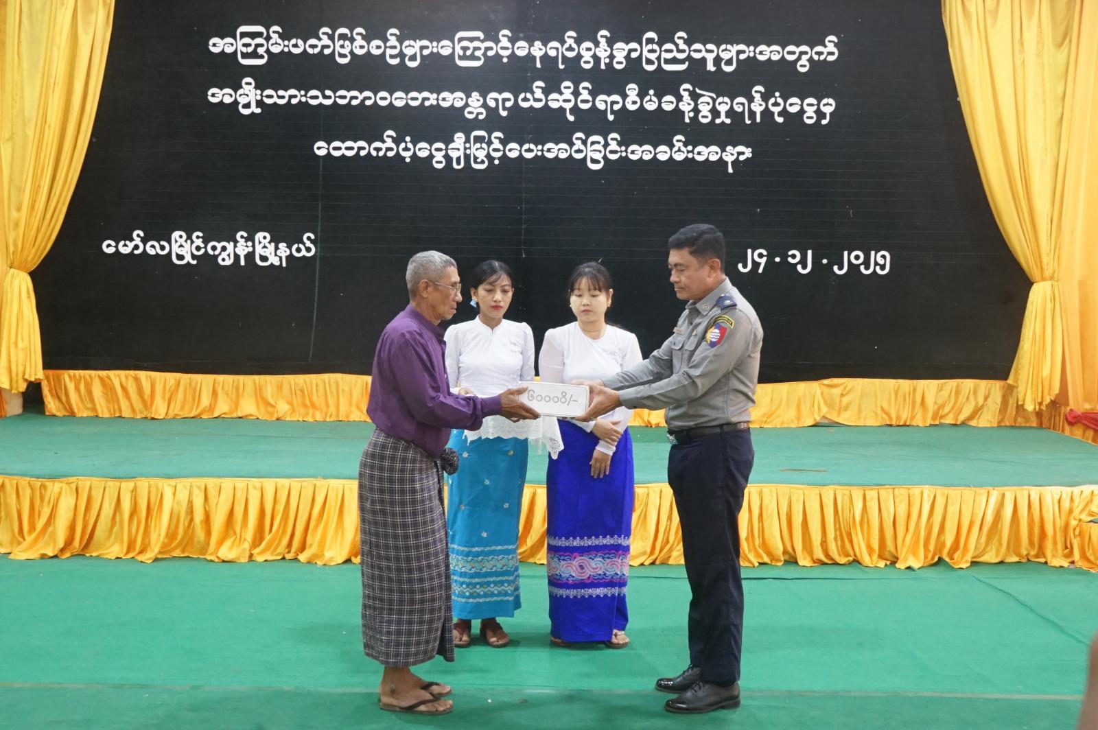 ထို့နောက် မြို့နယ်စီမံခန့်ခွဲရေးနှင့်အုပ်ချုပ်ရေးကော်မတီဥက္ကဋ္ဌနှင့်အဖွဲ့ဝင်များ၊ ဘေးအန္တရာယ် စီမံခန့်ခွဲမှုဆိုင်ရာဦးစီးဌာနမှ လက်ထောက်ညွှန်ကြားရေးမှူး ဒေါ်ဇာဇာလင်းတို့က ယာယီနေရပ်စွန့်ခွာပြည်သူများအား ပံ့ပိုးငွေများကိုနေရပ်စွန့်ခွာပြည်သူများထံသို့ လက်ဝယ်အရောက်ပေးအပ် ခဲ့သည်။