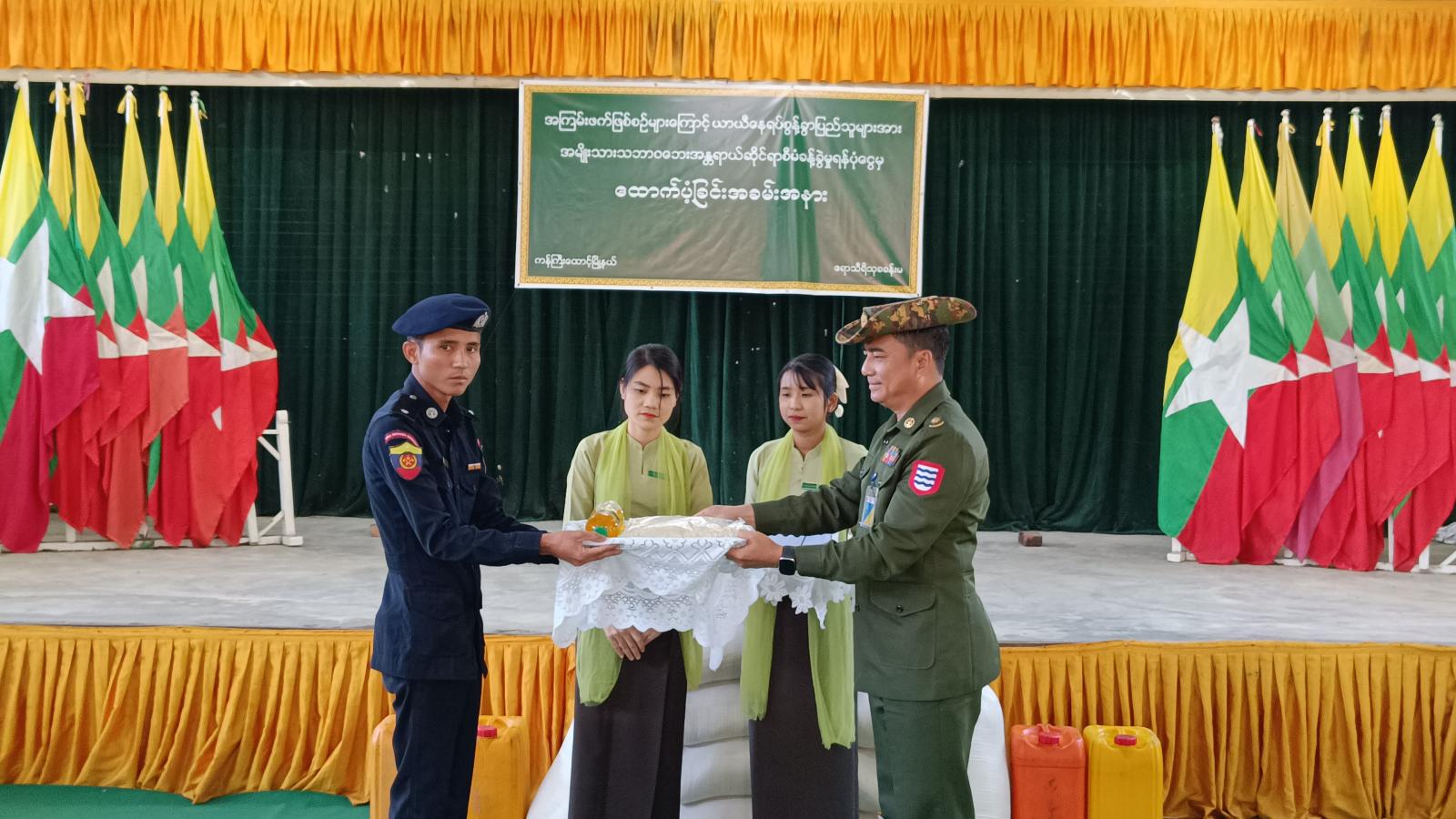 အခမ်းအနားတွင် မြို့နယ်စီမံခန့်ခွဲရေးနှင့်အုပ်ချုပ်ရေးကော်မတီဥက္ကဋ္ဌ ဦးမြင့်အောင်က အဖွင့်အမှာစကားပြောကြားခဲ့ပြီးအဖွဲ့ဝင် ဗိုလ်မှူးရဲနိုင်လွင်က ယာယီနေရပ်စွန့်ခွာ ပြည်သူများအား အမျိုးသားသဘာဝဘေးအန္တရာယ်ဆိုင်ရာစီမံခန့်ခွဲမှုရန်ပုံငွေမှ ထောက်ပံ့ခြင်းနှင့် ပတ်သက် ၍ အမှာစကားပြောကြားခဲ့သည်။