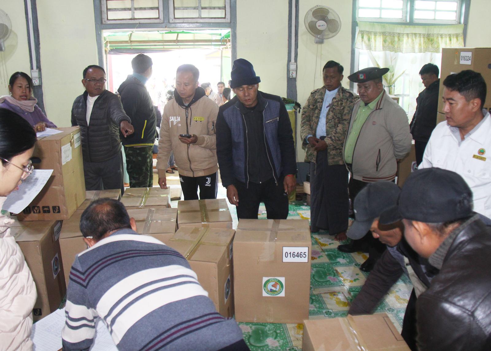 မြို့နယ်ရွေးကောက်ပွဲကော်မရှင်အဖွဲ့ခွဲဥက္ကဋ္ဌ ဦးအောင်ဆယ်၊ မြို့နယ်ရွေးကောက်ပွဲအရာရှိ ဒေါ်မျိုးမျိုးအောင်နှင့် မြို့နယ်ရွေးကောက်ပွဲကော်မရှင်အဖွဲ့ခွဲ အဖွဲ့ဝင်များက နမ့်စန်မြို့နယ်နှင့် ခိုလမ်မြို့အတွင်းရှိ မဲရုံများအတွက် ပြည်သူ့လွှတ်တော်၊ အမျိုးသားလွှတ်တော်၊ ပြည်နယ်လွှတ်တော်နှင့် သက်ဆိုင်ရာ တိုင်းရင်းသားလူမျိုးစုလွှတ်တော်တို့တွင် အသုံးပြုမည့် မြန်မာအီလက်ထရောနစ် မဲပေးစက်များ၊ အရံစက်များ၊ ဆက်စပ်ပစ္စည်းများနှင့် မဲရုံသုံးပစ္စည်းများကို သက်ဆိုင်ရာရပ်ကွက်နှင့် ကျေးရွာအုပ်စုရွေးကောက်ပွဲကော်မရှင်အဖွဲ့ခွဲဥက္ကဋ္ဌနှင့် အတွင်းရေးမှူးတို့ထံ စနစ်တကျထုတ်ပေးလျက်ရှိကြောင်း သိရသည်။