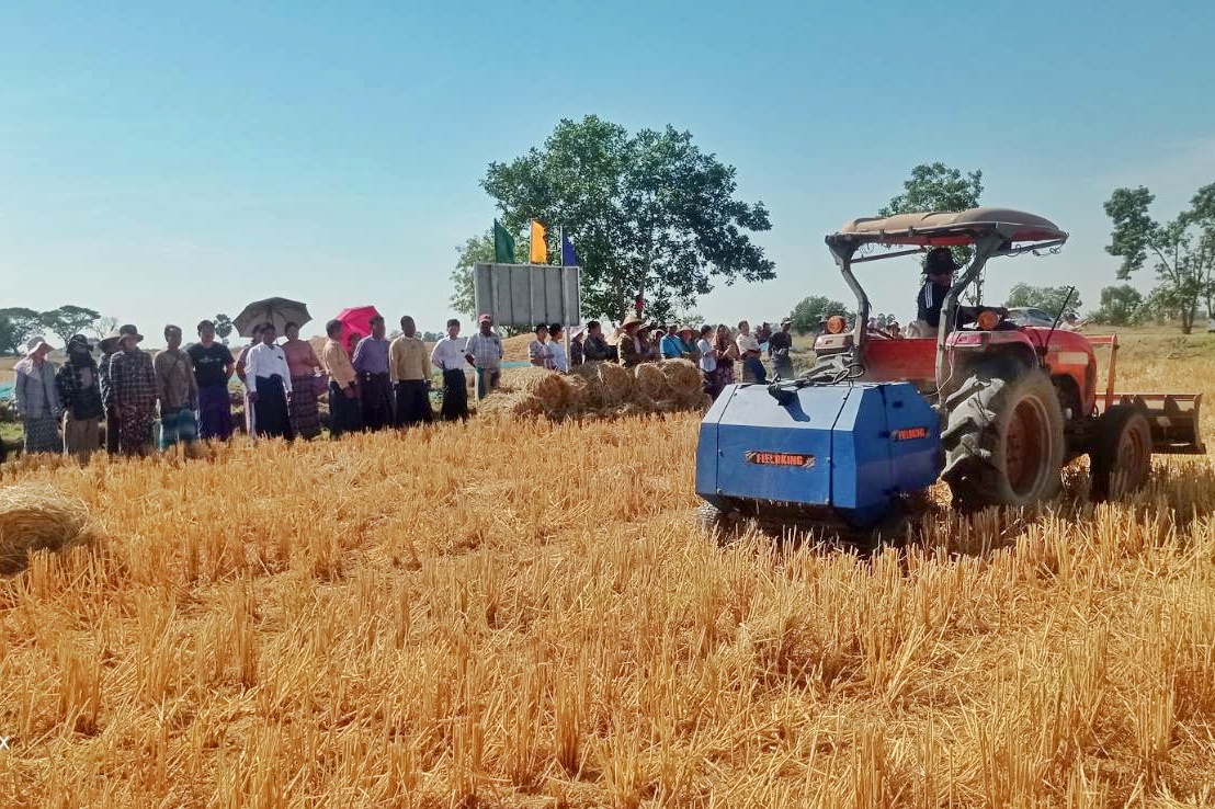 မွန်ပြည်နယ်၊ သထုံမြို့နယ်တွင် စက်မှုလယ်ယာဦးစီးဌာနမှ စီစဉ်ကျင်းပသည့် မိုးစပါးရိတ်သိမ်းချိန်ကာလ ကောက်ရိုးထုံးကိရိယာ (Round Baler) ဖြင့် ကောက်ရိုးထုံးခြင်း ကွင်းသရုပ်ပြပွဲကို ယမန်နေ့ နံနက်က မြေနီကုန်းကျေးရွာရှိ တောင်သူတစ်ဦး၏ လယ်ယာမြေ၌ ပြုလုပ်ခဲ့ကြသည်။