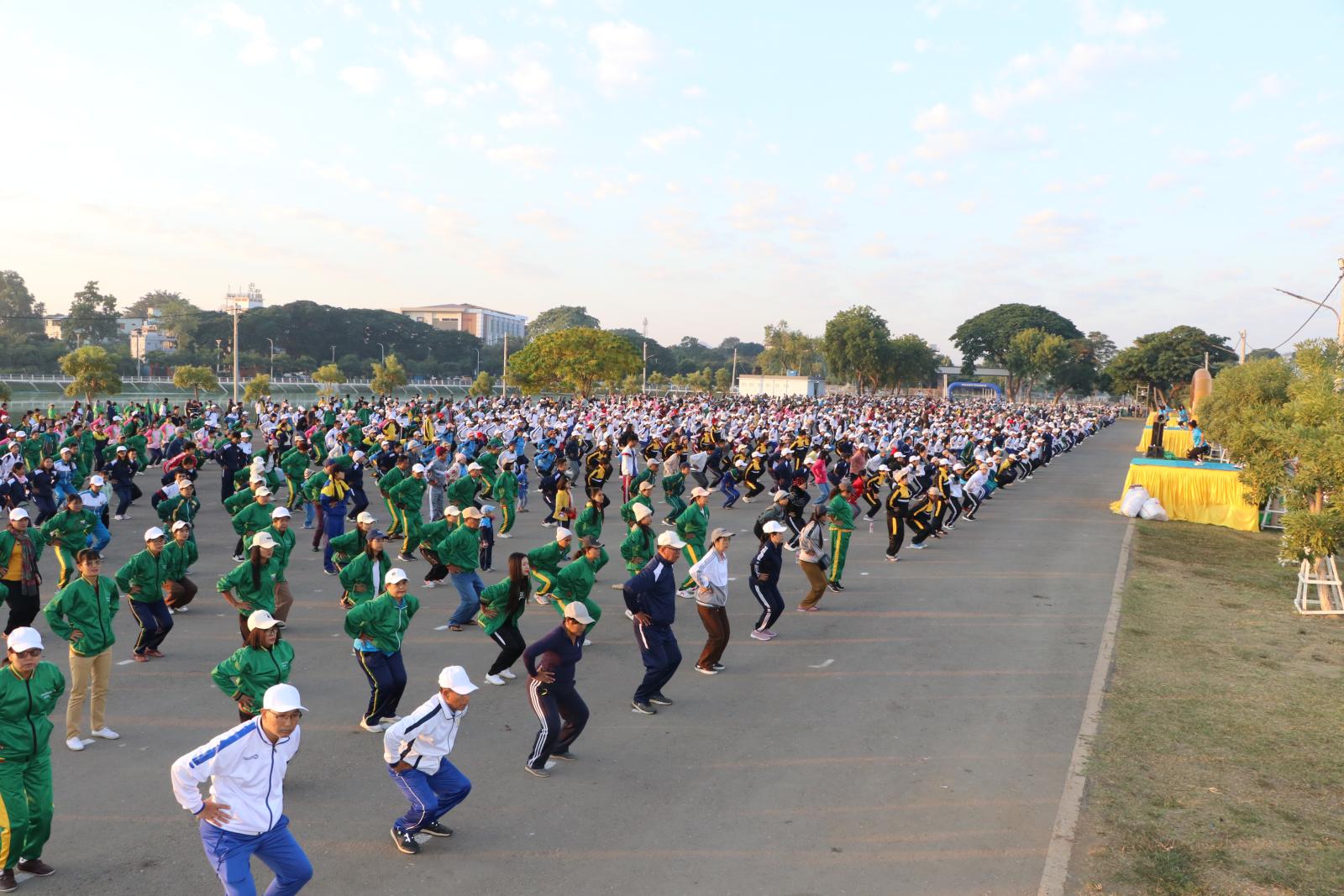 ယင်းနောက် အရှေ့ဘက်ကန်သာယာရှိ ပြည်ထောင်စုရင်ပြင်သို့ ပြန်လည်ဝင်ရောက်ခဲ့ကြပြီး အဆိုပါရင်ပြင်၌ ၆ ပေခြား စနစ်တကျနေရာယူကြကာ တိုင်းဒေသကြီး အားကစားနှင့် ကာယပညာဦးစီးဌာနမှ ဝန်ထမ်းများ၏ ကိုယ်ကာယလေ့ကျင့်ခန်းအတွဲ (၁)အတွဲ(၂) သရုပ်ပြသ မှုများနှင့် Physical Fltness Dance တေးသီချင်းများဖြင့် သွေးပူလေ့ကျင့်ခန်းအား စုပေါင်းဆောင်ရွက်ခဲ့ကြသည်။
