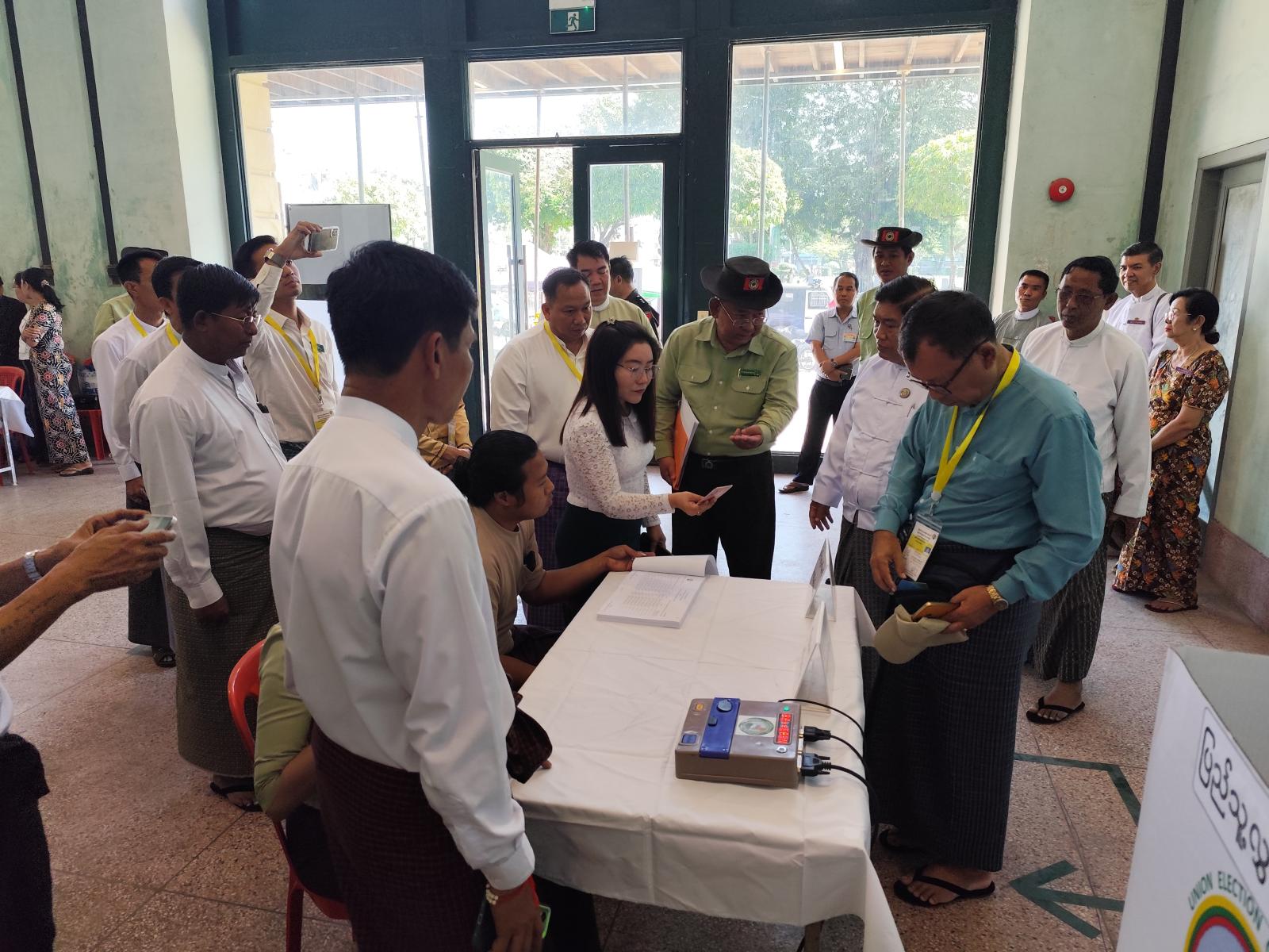 ထိုသို့စစ်ဆေးရာတွင် ခရိုင်စီမံခန့်ခွဲရေးနှင့်အုပ်ချုပ်ရေးကော်မတီဥက္ကဋ္ဌ ဦးဥက္ကာနှင့်တာဝန်ရှိသူများက မဲရုံပြင်ဆင်ထားရှိမှုနှင့်မြန်မာအီလက်ထရောနစ်မဲပေးစက်တပ်ဆင်ထားရှိမှုများကို ရှင်းလင်းတင်ပြရာ လမ်းပန်းဆက်သွယ်ရေးဝန်ကြီးက ကြည့်ရှုစစ်ဆေး စမ်းသပ်ခဲ့ပြီး လိုအပ်သည်များကို ပေါင်းစပ်ဆောင်ရွက်သည်။