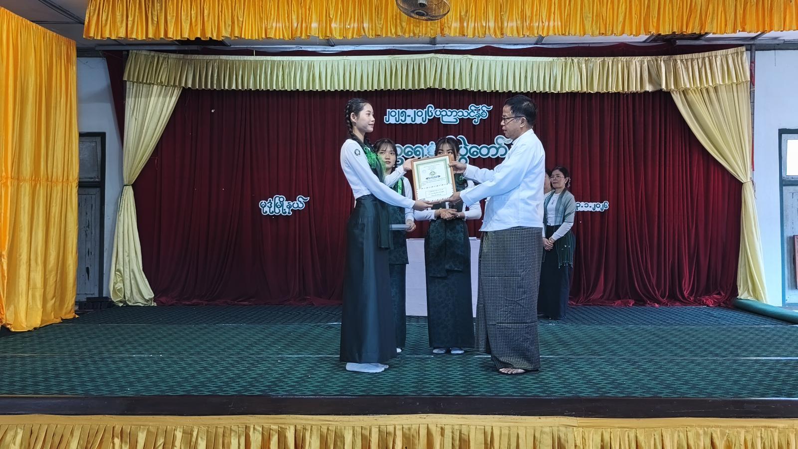 ယင်းနောက် Clean and Green ဆုရကျောင်းများ၊ နိုင်ငံတော်အဆင့် ထူးချွန်ဆုရ ကျောင်းသား၊ ကျောင်းသူများ၊ မြို့နယ်အဆင့် စာပေ၊ ဉာဏ၊ ကာယ၊ အနုပညာ ကဏ္ဍအလိုက် ထူးချွန်ဆုရ ကျောင်းသား၊ ကျောင်းသူလေးများအား တာဝန်ရှိသူများက ဂုဏ်ပြုဆုများ အသီးသီးပေးအပ်ချီးမြှင့်ခဲ့ကြပြီး ကျောင်းသား၊ ကျောင်းသူလေးများက အကအလှ ပဒေသာ၊ တေးသရုပ်ဖော်များဖြင့် တင်ဆက်ကပြဖျော်ဖြေခြင်းနှင့် “ဘက်စုံပညာကိုရည်တို့လှမ်းချီ” တေသီးချင်သီဆို၍ အခမ်းအနားအား ရုပ်သိမ်းခဲ့၍ မြို့နယ်အဆင့်ပညာရေးစုံညီပွဲတော်ကို စည်ကားသိုက်မြိုက်စွာ ကျင်းပခဲ့ကြောင်း သိရသည်။