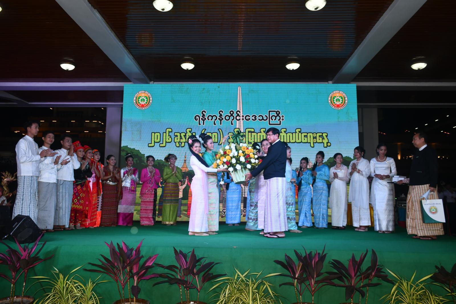 ညစာသုံးဆောင်စဉ် အမျိုးသားယဉ်ကျေးမှုနှင့် အနုပညာတက္ကသိုလ် (ရန်ကုန်) မှ ကျောင်းသား၊ ကျောင်းသူများနှင့် အနုပညာပညာရှင်များက ပဏာမ ဧည့်ခံဂီတသံ၊ “မင်္ဂလာပါ” ယိမ်း အက၊ “ထာဝရအဓိဌာန်” သီချင်း၊ “သစ္စာတူပြိုင် ချစ်မဏ္ဍိုင်” နှစ်ပါးသွားအက၊ “မြန်မာပြည်သား” သီချင်း၊ “လှမျိုးစုံကြွယ်ယဉ် တစ်ကိုယ်မယ်” (ခေတ် ၆ ခေတ်) အက၊ “လုလင်ငယ်သွေး” သီချင်း၊ “မိုးဇာဗျော” ယိမ်းအက၊ “ပန်းဥယျာဉ်ဝယ်ဆိုကြကကြမယ်” ယိမ်းအက၊ “ဇာတိမာန်” သီချင်း၊ “မလေးလက်ခတ်သံ” ယိမ်းအက၊ “ပြည်ထောင်စုရဲ့ ထာဝရအလှ” တိုင်းရင်းသားယိမ်းအကစသည့် တေးသီချင်းအကများဖြင့် သီဆိုကပြဖျော်ဖြေခဲ့ကြသည်။