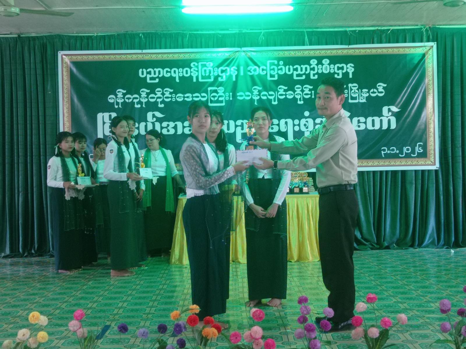 ထို့နောက် ၂၀၂၅- ၂၀၂၆ ပညာသင်နှစ်အတွင်း တိုင်း၊ ခရိုင်၊ မြို့နယ်အဆင့်များတွင် သက်ဆိုင်ရာအတန်းအလိုက် ပညာရည်ချွန်ဆုနှင့် ဘက်စုံထူးချွန်ဆု ရရှိကြသည့် ကျောင်းသား၊ ကျောင်းသူများနှင့် ထိုကဲ့သို့ ထူးချွန်အောင် သင်ကြား ပြသပေးခဲ့ကြသည့် ဆရာ၊ ဆရာမများအား မြို့နယ်စီမံအုပ်ချုပ်ရေးအဖွဲ့ ဥက္ကဋ္ဌ ဦးအောင်ရဲနှင့် ဌာနဆိုင်ရာ တာဝန်ရှိသူများ၊ ကျောင်းအုပ်ဆရာ၊ ဆရာမများနှင့် ကျောင်းအကျိုးတော်ဆောင်များက ဂုဏ်ပြုဆုများ အသီးသီးပေးအပ် ချီးမြှင့်ခဲ့ကြပြီး၊ ကျောင်းသား၊ ကျောင်းသူလေးများက တေးသီချင်းများ၊ တေးသရုပ်ဖော်အကများဖြင့် ပျော်ရွှင်စွာ ကပြသီဆို ဖျော်ဖြေခဲ့ကြကြောင်း သတင်းရရှိသည်။