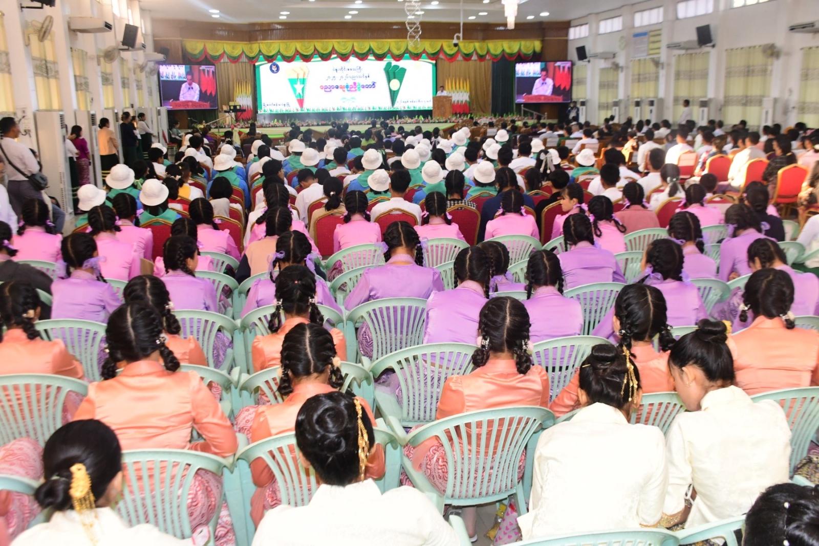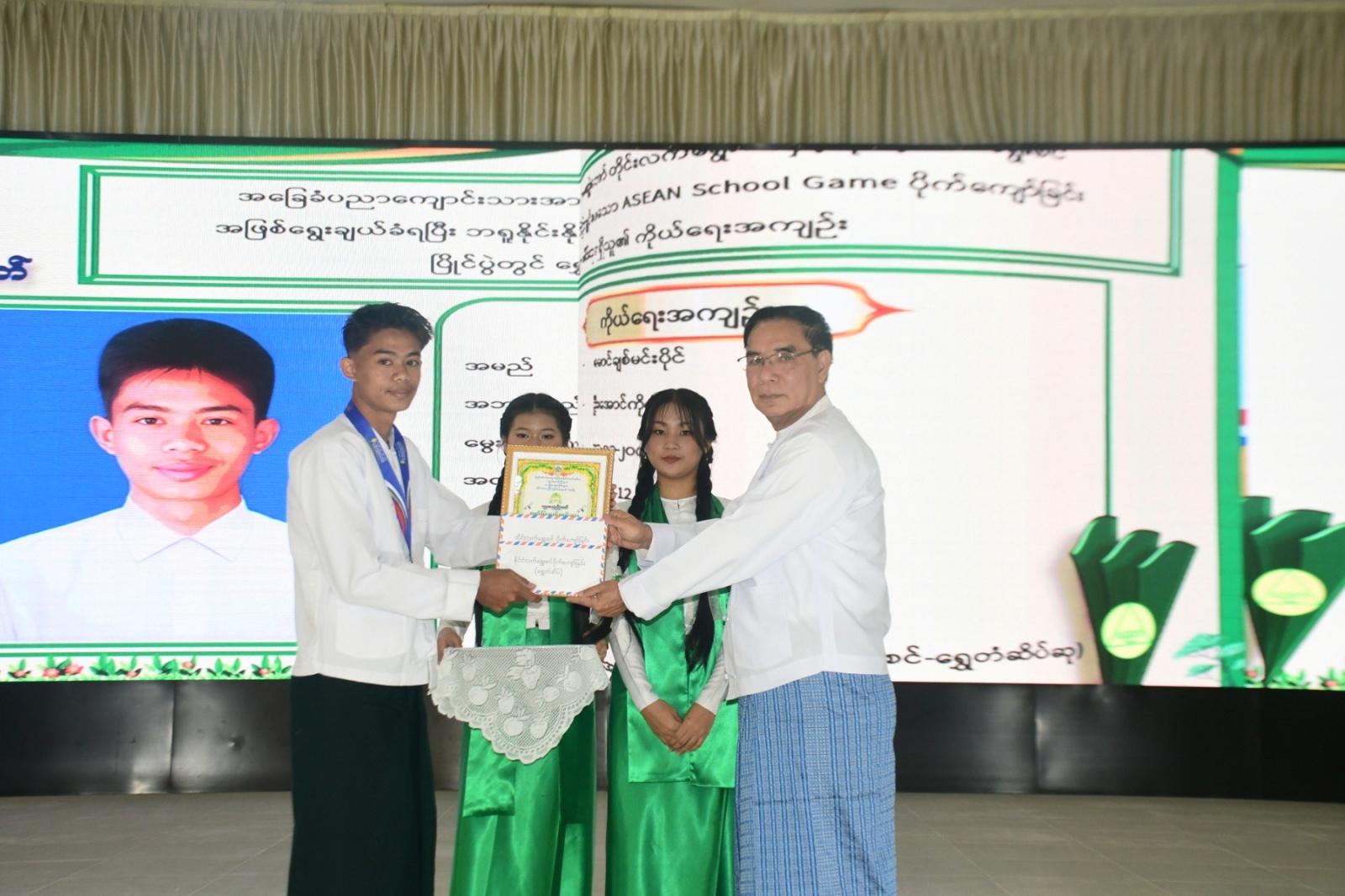 ယင်းနောက် ပဲခူးတိုင်းဒေသကြီးဝန်ကြီးချုပ် ဦးမျိုးဆွေဝင်းက နိုင်ငံတစ်ခုဒေသတစ်ခု ဖွံ့ဖြိုးတိုးတက်ဖို့ ပညာရေးကဏ္ဍသည် အလွန်အရေးကြီးပြီး ကျောင်းသား/သူများကို တီထွင်ဖန်တီးတတ်သူများ၊ တာဝန်ယူ/တာဝန်ခံတတ်သူများ၊ ပူးပေါင်းဆောင်ရွက်တတ်သူများ၊ ပြည်သူ့နီတိကို နားလည်ပြီး ဘဝတွင် ကြုံတွေ့လာနိုင်သည့် အခက်အခဲများကို ဖြေရှင်းနိုင်သော အရည်အသွေးပြည့်ဝသည့် လူချွန်လူကောင်းများဖြစ်စေရေး ဝိုင်းဝန်းပြုစု ပျိုးထောင်ပေးသွားရမှာဖြစ်ကြောင်း၊ ကျောင်းနေအရွယ်ကလေးတိုင်း အခမဲ့ပညာရေးစနစ်ဖြင့် ကျောင်းနေနိုင်ရေး ဆောင်ရွက်ပေးလျက်ရှိသလို အခက်အခဲအမျိုးမျိုးကြောင့် စာသင်ကျောင်းသို့ မလာရောက်နိုင်သည့် ကလေးများအတွက် ၂၀၂၄ - ၂၀၂၅ ခုနှစ်မှစ၍ ကျောင်းပြင်ပညာသင်ကြားရေးစနစ်ကို အကောင်အထည်ဖော်ပေးနိုင်ခဲ့ကြောင်း၊ မျက်မှောက်ခေတ်ကာလ၏ လူ့အဖွဲ့အစည်းကို ပညာကလွှမ်းမိုးသော ခေတ်ဖြစ်သည့်အတွက် ခေတ်မီဖွံ့ဖြိုးတိုးတက်သော နိုင်ငံတော်သစ်ကြီးတည်ဆောက်ရာတွင် ထူးချွန်ထက်မြက်သော လူ့စွမ်းအားအရင်းအမြစ်များဖြစ်သည့် လိုအပ်သဖြင့် ယခုလိုအခမ်းအနားကျင်းပ၍ ထူးချွန်ထက်မြက်သော ကျောင်းသား/သူများကို ချီးမြောက်ပေးရခြင်းဖြစ်ကြောင်းနှင့် အနာဂတ်နိုင်ငံတော်၏ ပညာရေးကဏ္ဍဖွံ့ဖြိုးတိုးတက်စေရေး၊ တက္ကသိုလ်ဝင်တန်း အောင်ချက်မြင့်မားစေရေး အားလုံးဝိုင်းဝန်းကြိုးစားဆောင်ရွက်သွားကြစေလိုကြောင်း ပြောကြားခဲ့သည်။