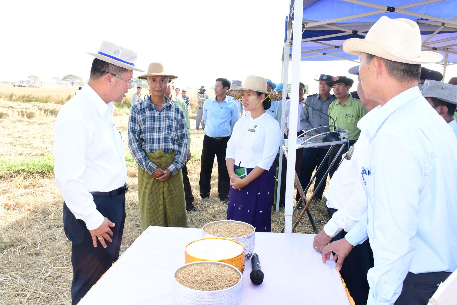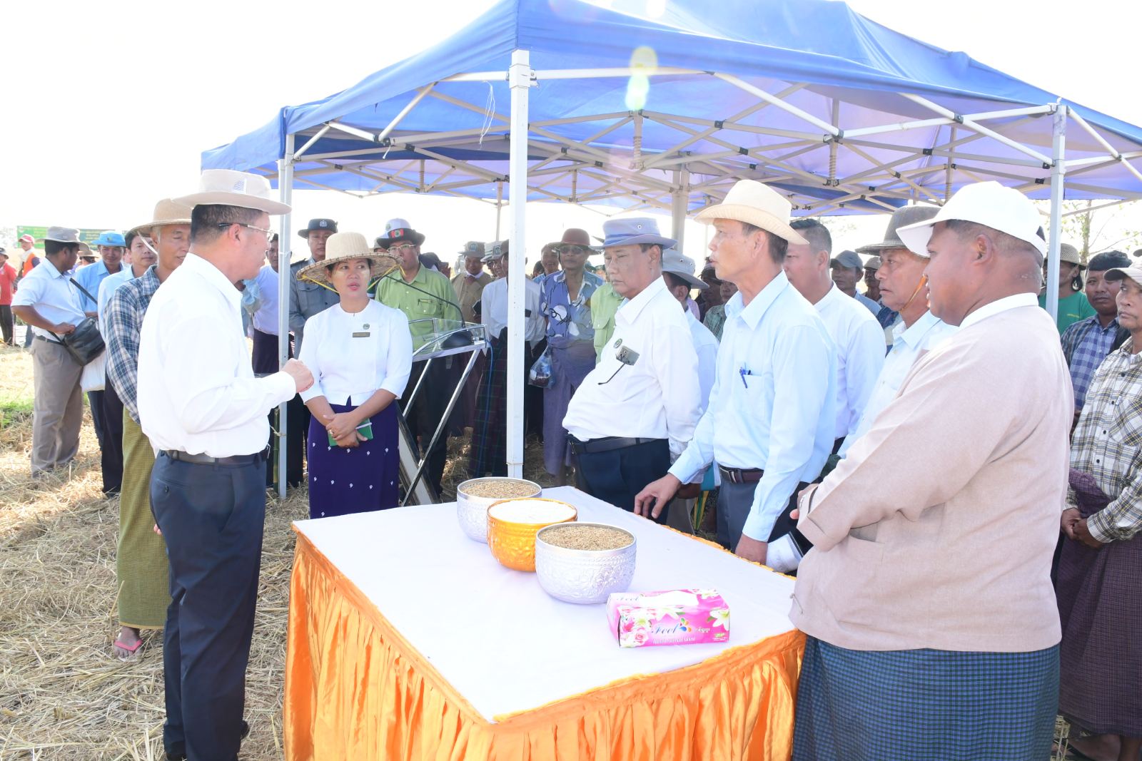 ဧရာဝတီတိုင်းဒေသကြီး၊ ကျုံပျော်ခရိုင်၊ ရေကြည်မြို့နယ်၊ နွားရေတိုက်ကျေးရွာတွင် ၂၀၂၅-၂၀၂၆ ခုနှစ်၊ ဧရာဝတီ(ရေကြည်) မိုးစပါးဓာတုကင်းလွတ်ပေါ်ဆန်းမွှေး (၂၅၀)ဧက အထူးဇုန် စံပြစိုက်ခင်းစံကွက်ရိတ်သိမ်းပွဲအခမ်းအနားကို ယမန်နေ့ညနေပိုင်းက တောင်သူဦးကြည်ခိုင်စိုး၏ စိုက်ဧက(၅၀)ဧကတွင် ပြုလုပ်ခဲ့ရာ စံကွက်ရိတ်သိမ်းပွဲသို့ တိုင်းဒေသကြီးဝန်ကြီးချုပ် ဦးတင်မောင်ဝင်းသည် တာဝန်ရှိသူများနှင့်အတူ တက်ရောက်ကြည့်ရှုအားပေးခဲ့သည်။