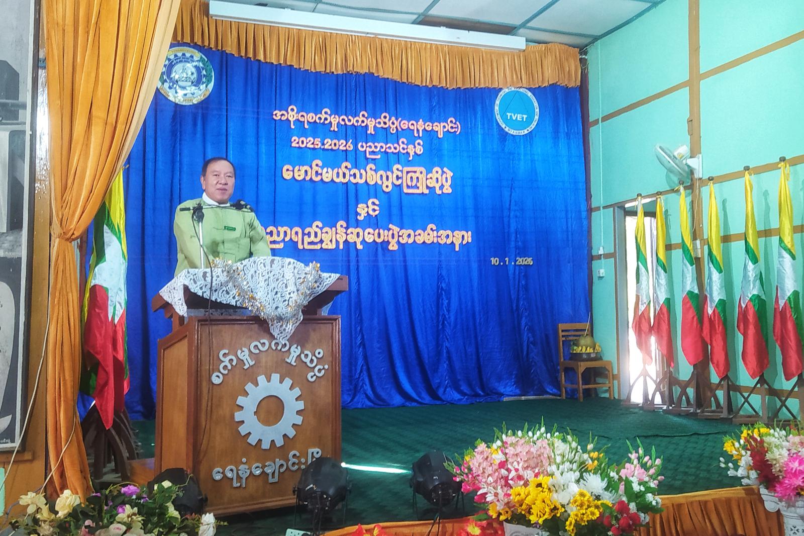 မကွေးတိုင်းဒေသကြီး ရေနံချောင်းမြို့နယ် အစိုးရစက်မှုလက်မှုသိပ္ပံ(ရေနံချောင်း)၌ ၂၀၂၅-၂၀၂၆ ပညာသင်နှစ် မေဂျာပေါင်းစုံ မောင်မယ်သစ်လွင်ကြိုဆိုပွဲနှင့် ပညာရည်ချွန်ဆုချီးမြှင့်ပွဲ အခမ်းအနားကို ယနေ့နံနက် ၈ နာရီက အဆိုပါကျောင်းခန်းမ၌ ကျင်းပသည်။