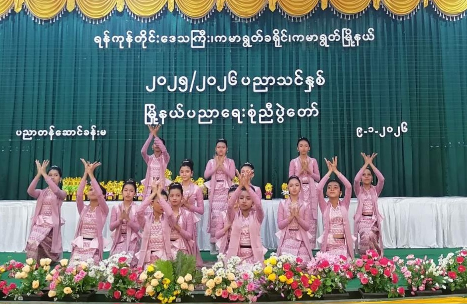 ဆက်လက်၍ အခမ်းအနားကို ဆက်လက်ကျင်းပရာ လေ့ကျင့်ရေးအထက်တန်းကျောင်း (တီတီစီ) မှ ကျောင်းသား၊ ကျောင်းသူများက “တယော” ဖြင့် မြန်မာ့ကျောင်းသီချင်းဧည့်ခံဖျော်ဖြေပြီး ကမာရွတ်မြို့နယ်၊ အမှတ် (၂) အခြေခံပညာအထက်တန်းကျောင်းမှ ကျောင်းသား၊ ကျောင်းသူများက “စုံညီပွဲတော်ဒို့နွဲပျော်” သီချင်းဖြင့် သီဆိုဖျော်ဖြေကြသည်။