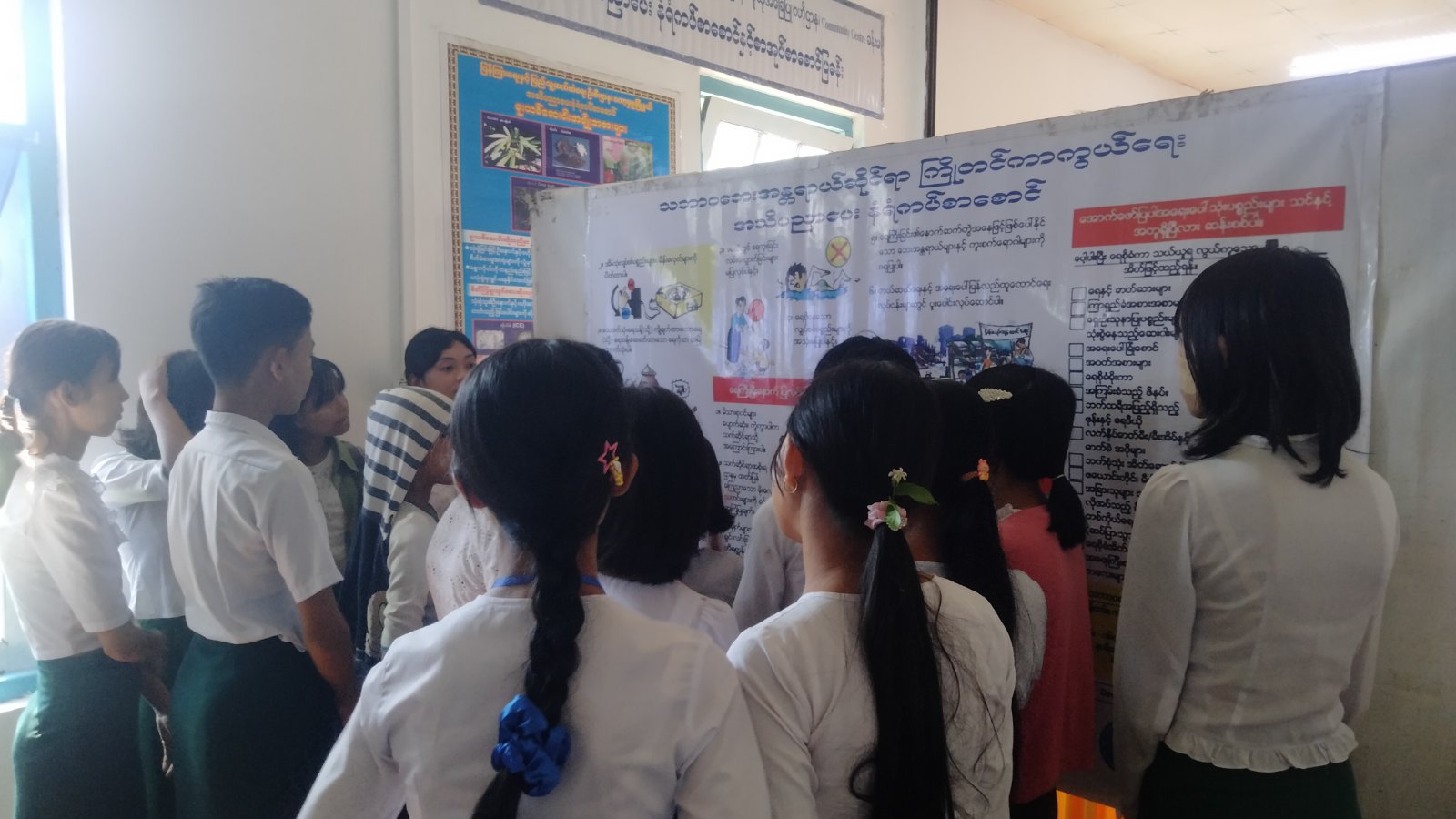 ဆက်လက်၍ ပြန်ကြားရေးနှင့်ပြည်သူ့ဆက်ဆံရေးဦးစီးဌာနမှ ပြသထားသောသဘာဝဘေး အန္တရာယ်ကြိုတင်ကာကွယ်ရေးအသိပညာပေး နံရံကပ်စာစောင်များ ပြသထားရာ ကျောင်းသား၊ ကျောင်းသူများ စိတ်ပါဝင်စားစွာ လေ့လာကြည့်ရှုနေကြကြောင်း သိရသည်။