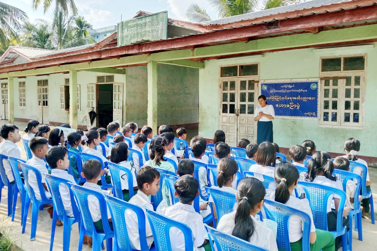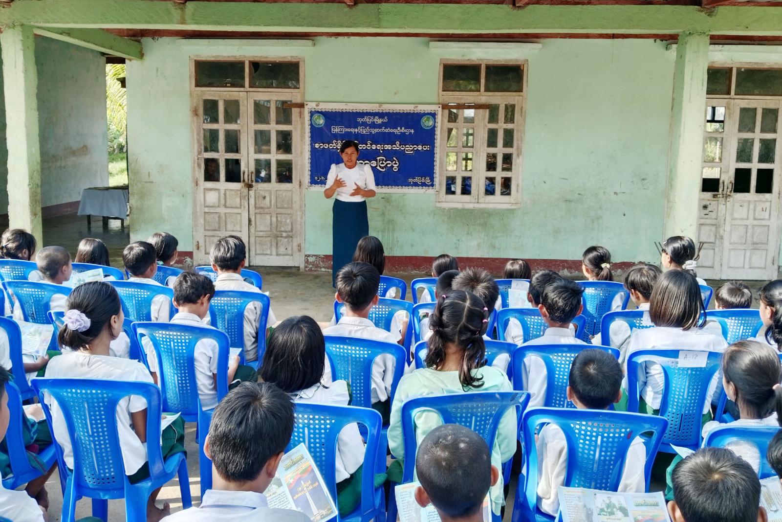 အသိပညာပေးဟောပြောပွဲတွင် မြို့နယ်ပြန်ကြားရေးနှင့်ပြည်သူ့ဆက်ဆံရေးဦးစီးဌာန၊ မြို့နယ်ဦးစီးမှူး ဒေါ်ဖြူဖြူသိန်းက စာဖတ်ရှိန်မြှင့်တင်ရေး ခေါင်းစဉ်ဖြင့် ဟောပြောခဲ့ရာ “ကျောင်းသား၊ ကျောင်းသူများအနေဖြင့် နောင်တစ်ချိန်တွင်နိုင်ငံနှင့် လူမျိုးအကျိုး သယ်ပိုးထမ်းရွက်ကြရမည်ဖြစ်၍ ယခုအရွယ်မှစပြီး ဗလငါးတန်နှင့်ပြည့်စုံအောင်၊ နိုင်ငံနှင့်လူမျိုးကိုချစ်မြတ်နိုးတတ်အောင်၊ တန်ဖိုးထားတတ်အောင် အသိပညာ၊ အတတ်ပညာများကို လေ့လာဆည်းပူးကြစေလိုပါကြောင်း၊ ရည်မှန်းချက်ထားရှိရမှာဖြစ်ကြောင်း၊ ပြင်ပဗဟုသုတရရှိစေရန် စာပေများဖတ်ရှုလေ့လာကြစေလိုပါကြောင်း၊ လာမည့်နွေရာသီကျောင်းပိတ်ရက်များတွင် ပြန်ကြားရေးနှင့်ပြည်သူ့ဆက်ဆံရေးဦးစီးဌာန၊ ပြည်သူ့စာကြည့်တိုက်တွင် အသိပညာဗဟုသုတရရှိစေရန် စာအုပ်စာပေများနှင့် သုတရသစာအုပ်စာစောင်များကို အခမဲ့လာရောက်ဖတ်ရှုပြီး ငှားရမ်းနိုင်ကြောင်း ပြောကြားခဲ့သည်။