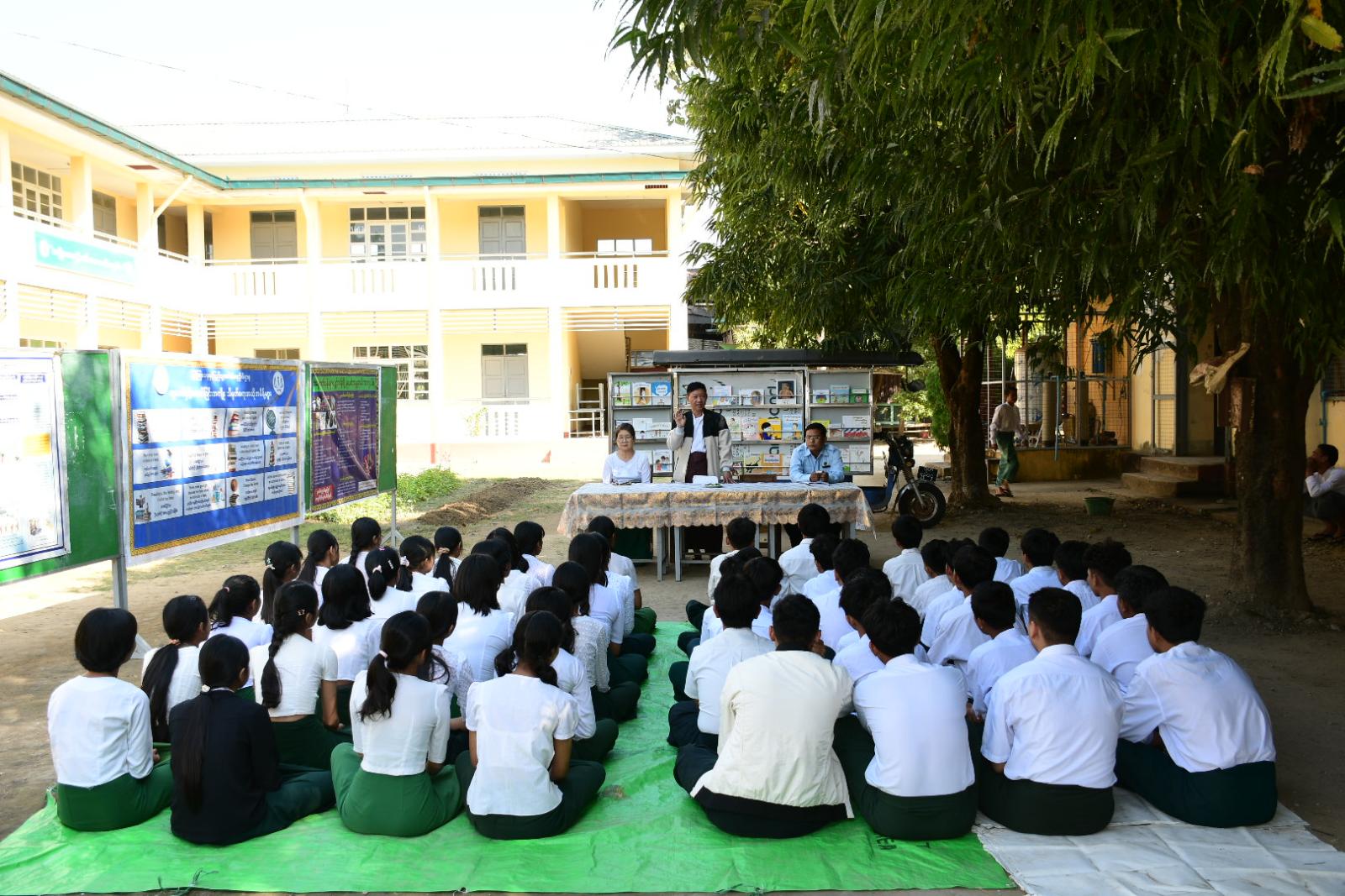 ထို့နောက် ကျောင်းသား၊ ကျောင်းသူများက ပြန်ကြားရေးနှင့်ပြည်သူ့ဆက်ဆံရေးဦးစီးဌာန နယ်လှည့်စာကြည့်တိုက်သုံးဘီးယာဉ်မှ သုတ/ရသစာအုပ် စာစောင်များနှင့် ခင်းကျင်းပြသထားသော မူးယစ်ဆေးဝါးအန္တရာယ်သိမှတ်ဖွယ်နှင့် ကလေးအလုပ်သမားပပျောက်ရေး၊ စာဖတ်ရှိန်မြှင့်တင်ရေးအသိပညာပေး နံရံကပ်စာစောင်များကို စိတ်ဝင်တစား ဖတ်ရှုလေ့လာကြကြောင်းသိရသည်။