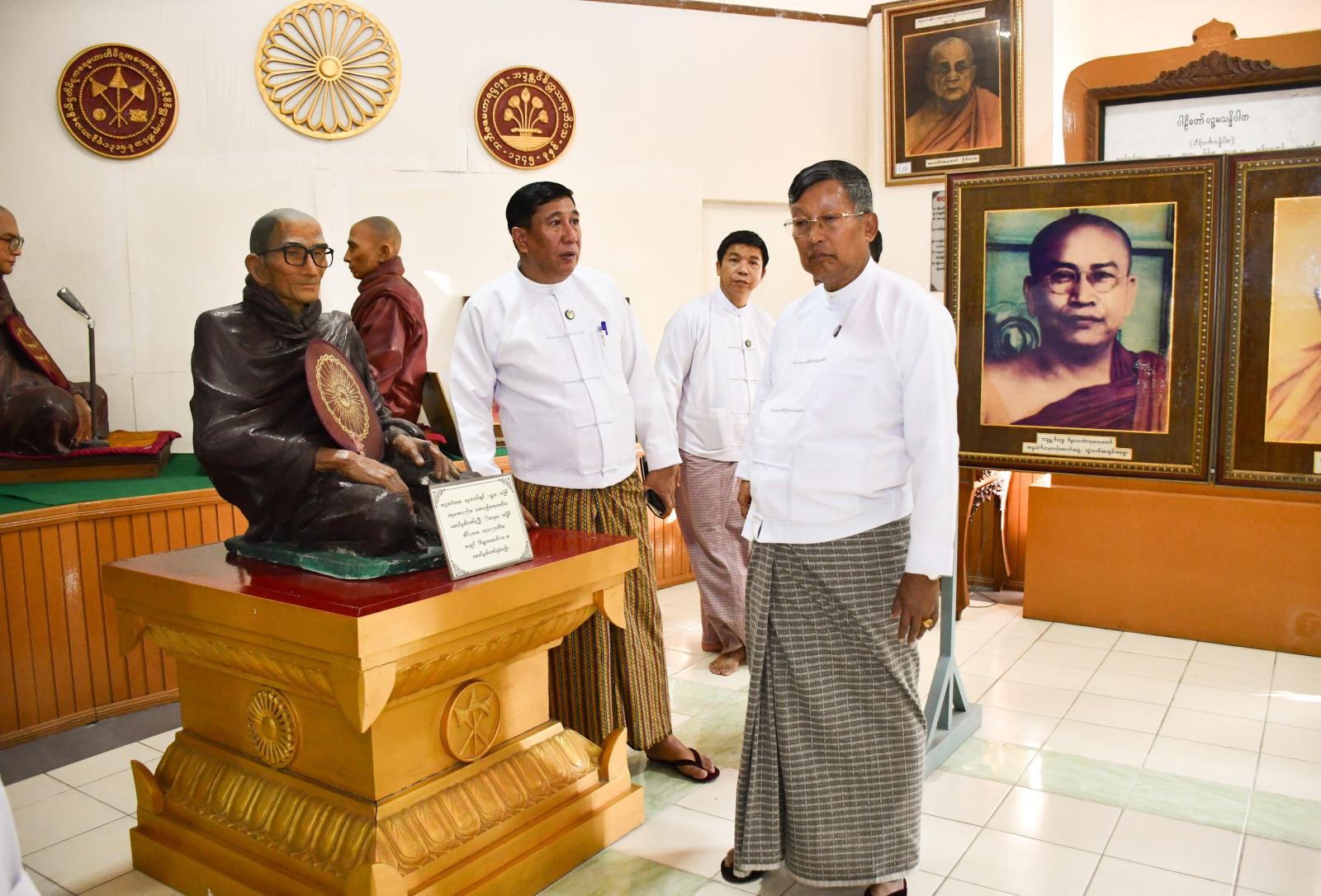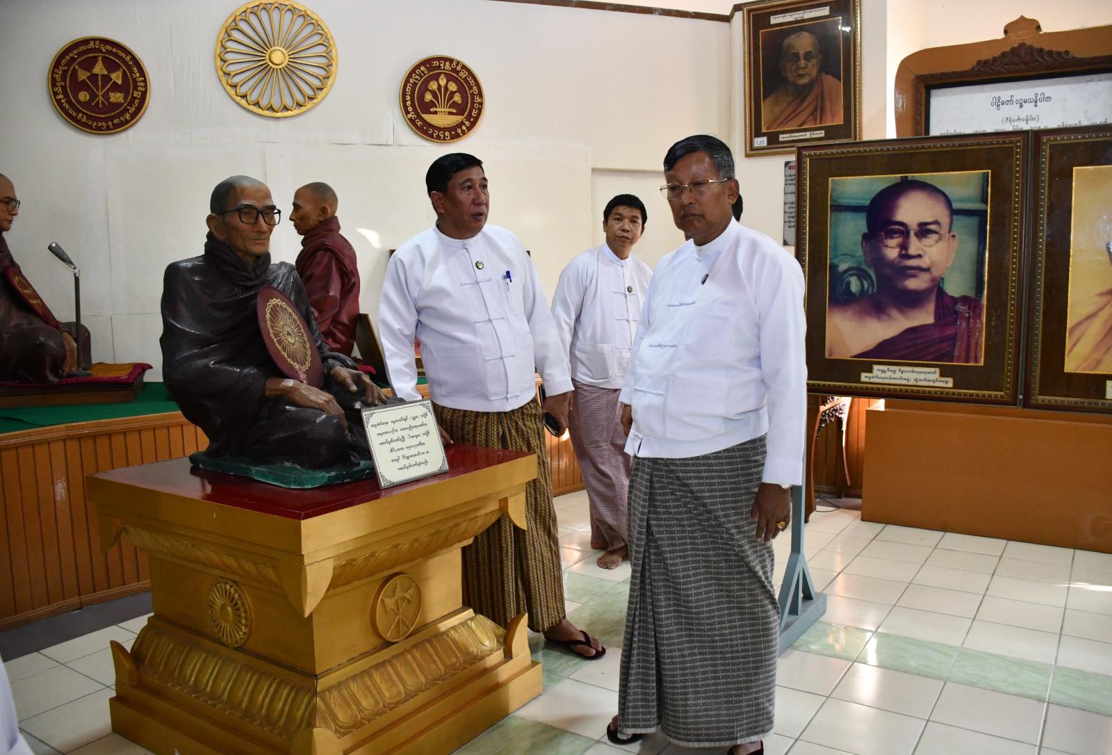 မွန်းလွဲပိုင်းတွင် ပြည်ထောင်စုဝန်ကြီးသည် တာဝန်ရှိသူများနှင့်အတူ ရန်ကုန်တိုင်းဒေသကြီး မရမ်းကုန်းမြို့နယ် သီရိမင်္ဂလာကမ္ဘာအေးကုန်းမြေရှိ ဆဌသင်္ဂါယနာတင်သာသနာ့သမိုင်းဝင် ပုဗ္ဗဝိဒေဟကျောင်းဆောင်အပရဂေါယာန ကျောင်းဆောင်ဇမ္ဗူဒီပ၊ ကျောင်းဆောင်နှင့် ဥတ္တရကုရုကျောင်းဆောင်များ အဆင့်မြှင့်တင်မွမ်းမံခြင်းလုပ်ငန်းများ (Phase11) ဆောင်ရွက်နေမှုကို လှည့်လည်ကြည့်ရှုစစ်ဆေးသည်။