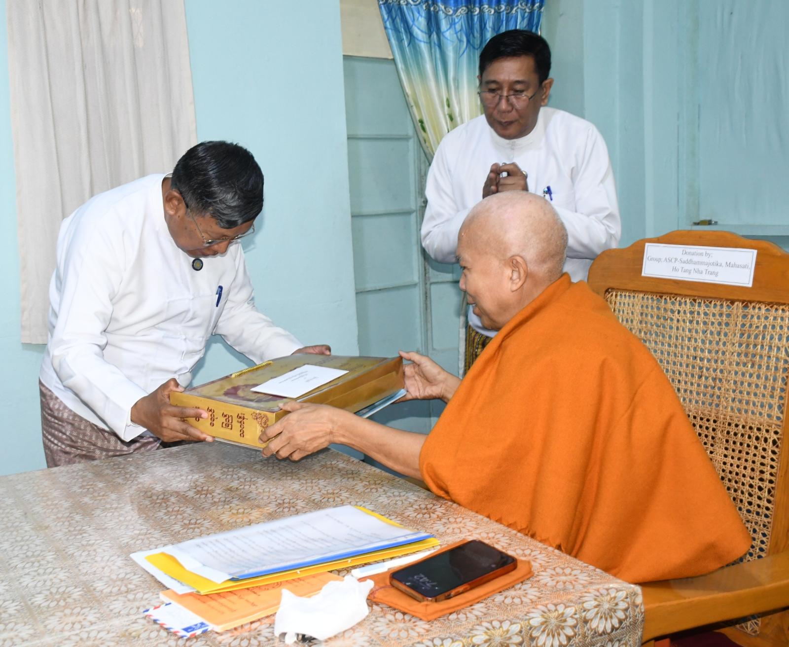 အာရုံပြန်ဆိုပြီးစီးသည့် ဆရာတော်များအားအာဂုံအောင်စာရင်း ထုတ်ပြန်နိုင်ရေး ညှိနှိုင်းအစည်းအဝေးကို ယနေ့နံနက် ၇ နာရီခွဲတွင် ကမ္ဘာအေးကုန်းရှိ ပုဗ္ဗ၀ိဒေဟကျောင်းဆောင် မြေညီထပ်ရှိ ဓမ္မသုခအစည်းအဝေးခန်းမ၌ ကျင်းပရာတိပိဋကဓရတိပိဋကကောဝိဒ သြဝါဒါစရိယဆရာတော်ကြီး ၉ ပါးကြွရောက် ချီးမြှင့်တော်မူပြီး သာသနာရေးနှင့်ယဉ်ကျေးမှုဝန်ကြီးဌာန ပြည်ထောင်စုဝန်ကြီး ဦးတင်ဦးလွင်သည် ဌာနဆိုင်ရာတာဝန်ရှိသူများနှင့်အတူ ဆရာတော်ကြီးများအား ဖူးမြော်ကြည်ညို၍ သင်္ကန်းနှင့် နဝကမ္မဝတ္ထုတို့ကို ဆက်ကပ်လှူဒါန်းကြသည်။