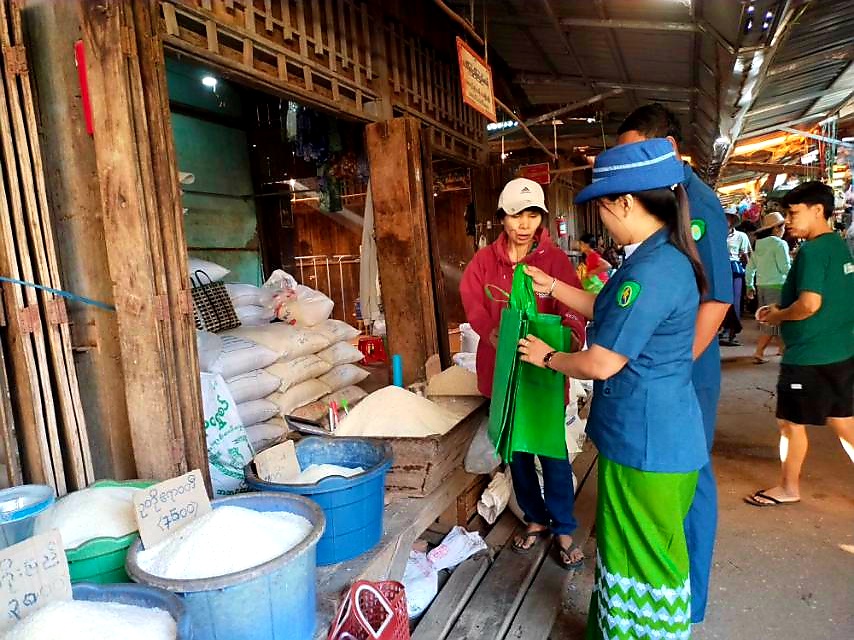 ထိုသို့အပတ်စဥ် ဗုဒ္ဓဟူးနေ့တိုင်း ကြွပ်ကြွပ်အိတ်၊ ပလတ်စတစ်အိတ်များ မသုံးစွဲရေးအသိပေးလုပ်ငန်းများကို မြို့နယ်စည်ပင်သာယာရေးအဖွဲ့ အမှုဆောင်အရာရှိ ဦးအောင်စိုးနှင့်ဝန်ထမ်းများက မြို့နယ်စည်ပင်သာယာရေးအဖွဲ့ပိုင် သီရိရွှေသာဈေးရှိ စျေးရောင်းချသူများအနေဖြင့် အပတ်စဥ် ဗုဒ္ဓဟူးနေ့တိုင်း ကြွပ်ကြွပ်အိတ်၊ပလတ်စတစ်အိတ်အစား အင်ဖက်၊ ငှက်ပျောဖက်၊ သတင်းစာစက္ကူတို့ဖြင့် စသည့်သင့်တော်ရာအစားထိုး ထုတ်ပိုးသုံးစွဲစေရေးအတွက် ပြည်သူများအား ကျယ်ကျယ်ပြန့်ပြန့် သိရှိနိုင်စေရေးအတွက် အသိပေးဆိုင်းဘုတ်များ စိုက်ထူခြင်း၊ လက်ကိုင်စပီကာများနှင့် ပြည်သူများ ပါဝင်ဆောင်ရွက်ပေးနိုင်ရေး အသိပညာပေးနှိုးဆော်ပြီး လိုက်လံစိစစ်ကြပ်မတ်၍ ကြွပ်ကြွပ်အိတ်၊ ပလတ်စတစ်အိတ် အသုံးပြုသူတွေ့ရှိပါက စီမံဒဏ်ကြေးငွေပေးဆောင်စေလျက် အရေးယူဆောင်ရွက်လျက်ရှိရာ ပြည်သူများမှ ပူးပေါင်းပါဝင်လိုက်နာဆောင်ရွက်လျက်ရှိကြောင်း သိရသည်။