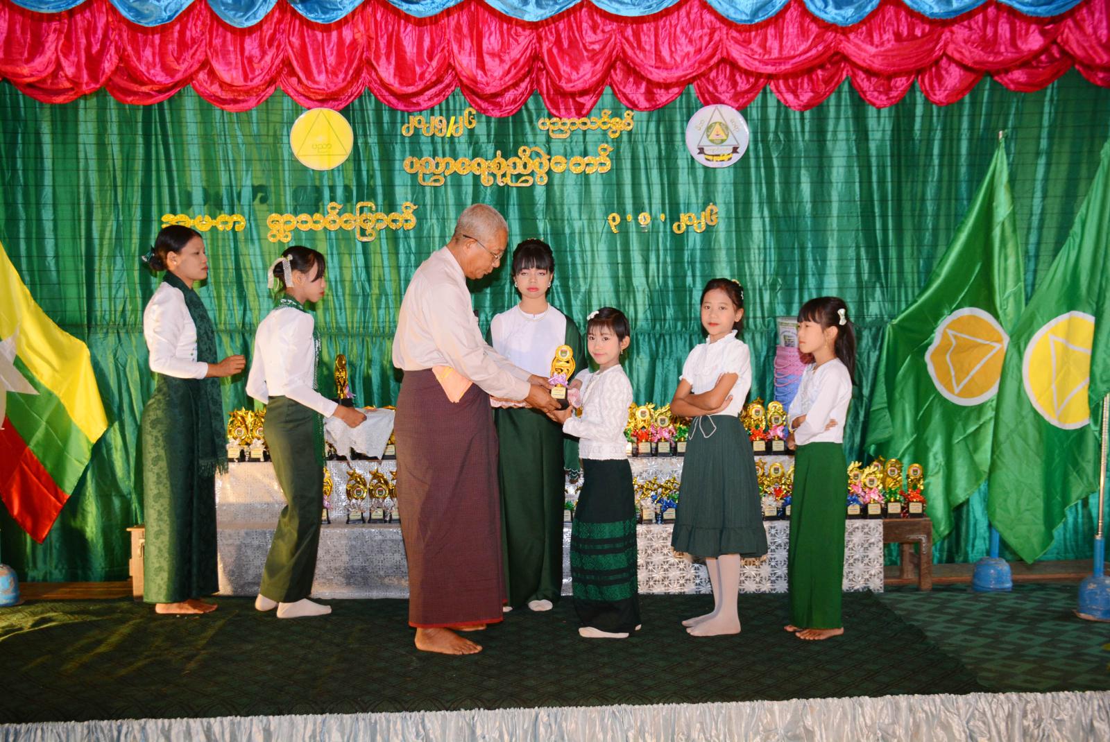 ထို့နောက် ၂၀၂၄-၂၀၂၅ ပညာသင်နှစ်၊ ၂၀၂၅-၂၀၂၆ ပညာသင်နှစ်တို့တွင် ဘာသာရပ်ထူးချွန်ဆု၊ ကာယဉာဏထူးချွန်ဆုများကို မြို့နယ်ရဲတပ်ဖွဲ့မှူးမှ ရဲမှူးကြည်စိုးနှင့် မြို့နယ်ပညာရေးမှူးရုံးမှ လက်ထောက်ပညာရေးမှူး၊ ကျောင်းစုမှူးနှင့်ကျောင်းအုပ်ကြီးများ၊ ကျောင်းအကျိုးတော်ဆောင်အဖွဲ့ ဝင်များ၊ မိဘများက အသီးသီးဆုများပေးအပ်ကြပြီး မပန်းရတီမြင့်မိုရ်က “လမ်းပြကြယ်” သီဆိုဖျော် ဖြေ၍ အခမ်းအနားကို ရုပ်သိမ်းခဲ့ကြကြောင်း သိရသည်။