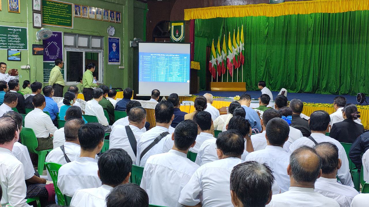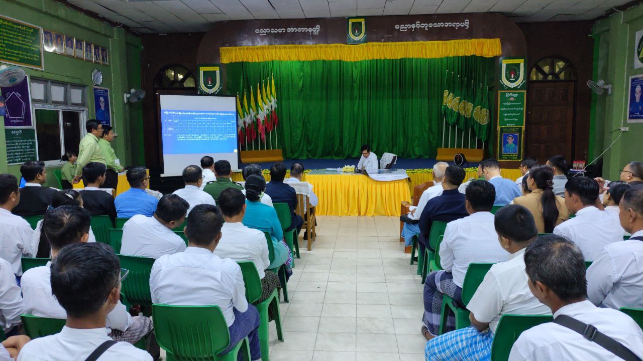 ရှေးဦးစွာ ဇန်နဝါရီလ (၂၅) ရက်နေ့တွင် ကျင်းပပြုလုပ်မည့် ပါတီစုံဒီမိုကရေစီ အထွေထွေရွေးကောက်ပွဲ အပိုင်း (၃) အောင်မြင်စွာ ကျင်းပနိုင်ရေးအတွက် မြို့နယ်စီမံခန့်ခွဲရေးနှင့် အုပ်ချုပ်ရေးကော်မတီဥက္ကဋ္ဌ ဦးဖြိုးသူမောင်က မြို့နယ်အတွင်းမဲရုံ (၈၇) နှင့် ကရင်၊ ရခိုင် တိုင်းရင်းသားမဲဆန္ဒရှင်များအပါအဝင် မဲဆန္ဒရှင် (၁၁၆၇၄၆) ဦးရှိပါကြောင်း၊ မဲဆန္ဒရှင်အင်အားအလိုက် မဲရုံစာရင်းများ၊ မြို့နယ်အတွင်း မဲရုံများတွင် မဲရုံမှူး၊ ဒုမဲရုံမှူး၊ မဲရုံအဖွဲ့ဝင်များ ဖွဲ့စည်းထားရှိမှုများ၊ မြို့နယ်အတွင်း မြေပြင်ကွင်းဆင်းစစ်ဆေးမှုများ၊ အသံချဲ့စက်ဖြင့် လှည့်လည်နှိုးဆော်ဆောင်ရွက်မှုများ၊ လက်ကမ်းစာစောင်ဖြန့်ဝေနိုင်မှုများ၊ မဲရုံအမျိုးအစားများ၊ အခြေခံပညာကျောင်း (၁) ကျောင်းချင်းစီ အလိုက် မဲရုံဖွင့်လှစ်မှုအခြေနေများ၊ မဲရုံအရေအတွက်၊ မဲရုံတည်နေရာနှင့် Hand Speaker လိုအပ်ချက်များကို ဆွေးနွေးတင်ပြခဲ့သည်။