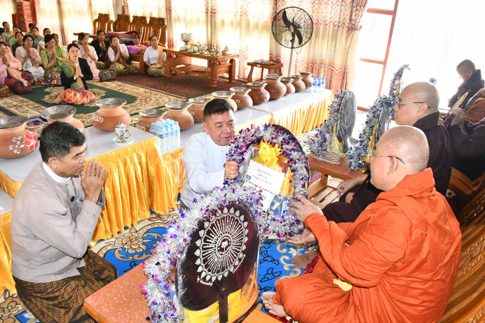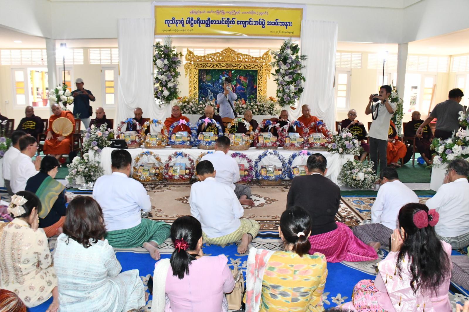 ထို့နောက် ဆရာတော်၊ သံဃာတော်အရှင်သူမြတ်များထံ ပြည်နယ်ဝန်ကြီးချုပ်၊ ပြည်နယ်တရားလွှတ်တော်တရားသူကြီးချုပ်နှင့် ပြည်နယ်ဝန်ကြီးများက လှူဖွယ်ဝတ္ထုပစ္စည်းများ ဆက်ကပ်လှူဒါန်းခဲ့ကြပြီး မော်လမြိုင်မြို့၊ လှိုင်ရပ်ကွက်၊ ရွှေတောင်ကျောင်းဆရာတော် ဘဒ္ဒန္တဝိမလ၊ (အဂ္ဂမဟာသဒ္ဓမ္မဇောတိကဓဇ၊ ဓမ္မကထိကဗဟုဇနဟိတဓရ၊ ဂန္တဝါစကပဏ္ဍိတ)ထံမှ အနုမောဒနာတရား နာယူကြည်ညို၍ လှူဒါန်းမှုအစုစုတို့အတွက် ရေစက်သွန်းချအမျှပေးဝေခဲ့ကြကာ အခမ်းအနားကို “ဗုဒ္ဓသာသနံစိရံတိဋ္ဌတု သုံးကြိမ်ရွတ်ဆိုဆုတောင်းကာ ဆရာတော်သံဃာတော်များအား နေ့ဆွမ်းဆက်ကပ်လှူဒါန်းခဲ့သည်။
